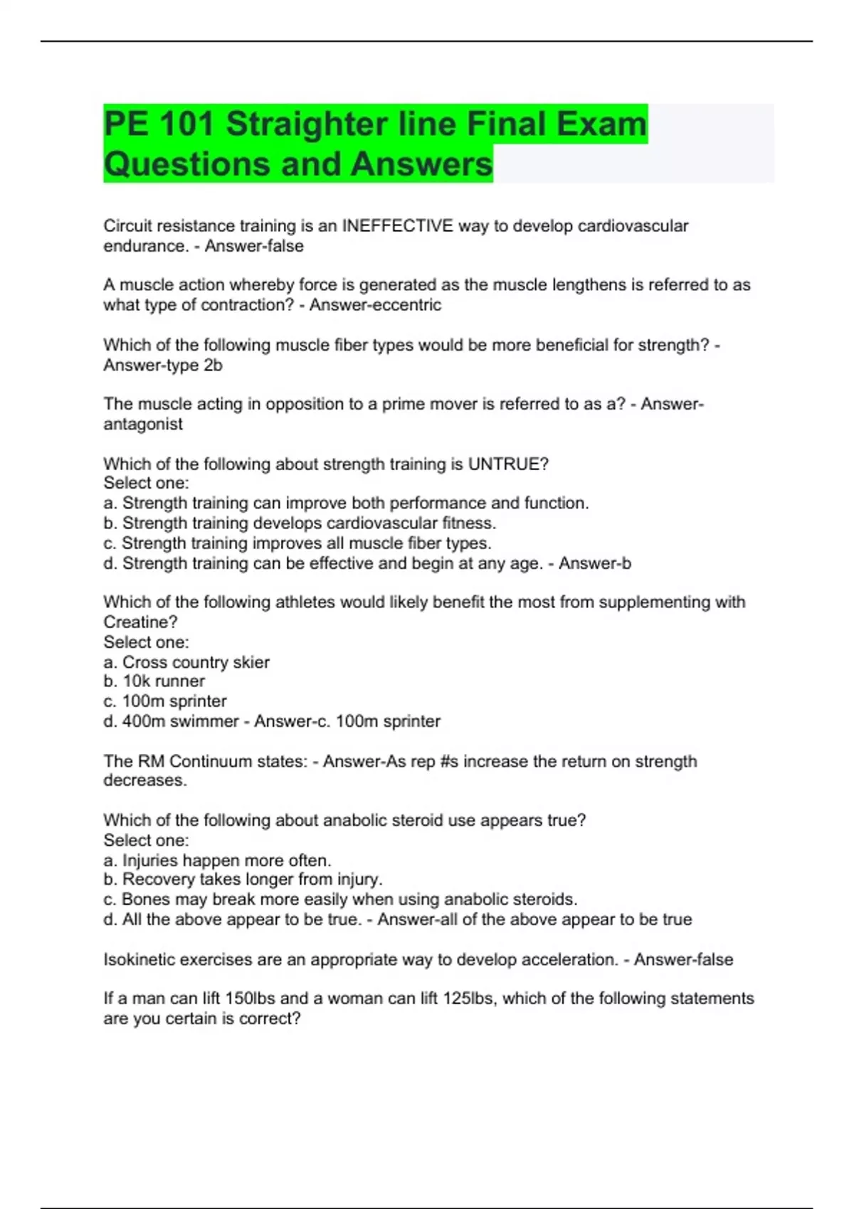 PE 101 Straighter line Final Exam Questions and Answers As we increase in age which of the following factors plays the greatest role in weight gain? Select one: a. Eating habits. b. Physical activity. c. Basal metabolism. d. B & C. - Answer-b & c The term that describes the stored form of carbohydrate in the muscle and liver is called: - Answer-glycogen The measurement of body fat is based on what scientific principle? - Answer-archimedes The insoluble product that is indigestible and found in most bulk foods is known as: - Answer-cellulose In measuring body fat it is estimated that: Select one: a. About half the body fat is located just under the skin. b. About half the body fat is located around the internal organs. c. Skinfold measurements are more accurate. d. All of the above are true. - Answer-all of the above The basic estimate for protein intake for an average adult is _________. - Answer-0.8g/kg. The body composition measurement that uses low level voltage to determine density differences is? - Answer-BIA Which of the following statements about body composition health is TRUE? Select one: a. Obesity remains a secondary risk factor for heart disease. b. Overfatness is the same risk as obesity for heart disease. c. Abdominal fat storage is associated with increased risk for heart disease.