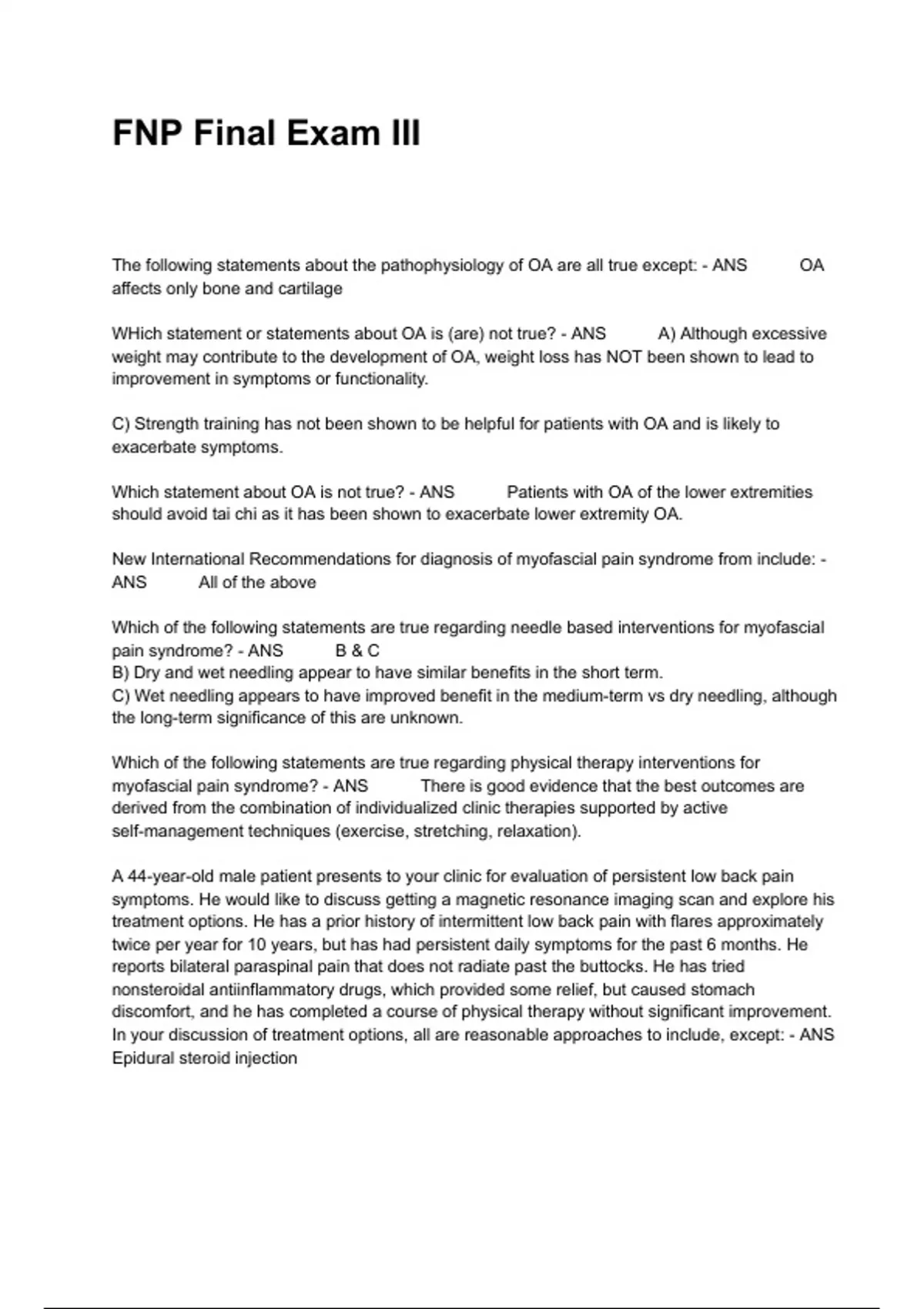 FNP Final Exam III The following statements about the pathophysiology of OA are all true except: - ANS OA affects only bone and cartilage WHich statement or statements about OA is (are) not true? - ANS A) Although excessive weight may contribute to the development of OA, weight loss has NOT been shown to lead to improvement in symptoms or functionality. C) Strength training has not been shown to be helpful for patients with OA and is likely to exacerbate symptoms. Which statement about OA is not true? - ANS Patients with OA of the lower extremities should avoid tai chi as it has been shown to exacerbate lower extremity OA. New International Recommendations for diagnosis of myofascial pain syndrome from include: - ANS All of the above Which of the following statements are true regarding needle based interventions for myofascial pain syndrome? - ANS B & C B) Dry and wet needling appear to have similar benefits in the short term. C) Wet needling appears to have improved benefit in the medium-term vs dry needling, although the long-term significance of this are unknown. Which of the following statements are true regarding physical therapy interventions for myofascial pain syndrome? - ANS There is good evidence that the best outcomes are derived from the combination of individualized clinic therapies supported by active self-management techniques (exercise, stretching, relaxation). A 44-year-old male patient presents to your clinic for evaluation of persistent low back pain symptoms. He would like to discuss getting a magnetic resonance imaging scan and explore his treatment options. He has a prior history of intermittent low back pain with flares approximately twice per year for 10 years, but has had persistent daily symptoms for the past 6 months. He reports bilateral paraspinal pain that does not radiate past the buttocks. He has tried nonsteroidal antiinflammatory drugs, which provided some relief, but caused stomach discomfort, and he has completed a course of physical therapy without significant improvement. In your discussion of treatment options, all are reasonable approaches to include, except: - ANS Epidural steroid injection Your patient asks your opinion on mind-body techniques to help with pain management. Which of the following statements is consistent with current evidence? - ANS Behavioral therapies as a whole have shown improvements in functional status in patients with low back pain. Which of the follow statements about acupuncture are incorrect? - ANS The American College of Physicians (ACP) low back pain guidelines list acupuncture as a primary treatment option for acute low back pain. Out of the following listed choices, which one has the strongest association with chronic pain? - ANS Physiological factors Which of the following statements is correct regarding acupuncture treatments for neck pain? - ANS Overall, there is moderate evidence in favor of acupuncture for treatment of chronic neck pain when compared to sham acupuncture Which of the following is true regarding the evidence base for hands-on approach to the treatment of chronic neck pain? - ANS A multimodal, team-based approach that utilizes several modalities, including hands-on body work, often results in the most effective long-term pain relief. When managing chronic gouty arthritis, titrate urate-lowering therapies to achieve serum uric acid levels less than: - ANS 6 Lifestyle recommendations for gout should include all of the following except: - ANS Avoidance of all purine-rich foods Appropriate pharmacological treatments of acute gouty flairs include (choose all correct): - ANS a. Indomethacin b. Naproxen d. Prednisone f. Colchicine (low dose) A 43-year-old female working in janitorial services presents with pain and weakness in her right hand. She admits that symptoms have worsened over the past couple of years and now remain almost constant and have affected her ability to grip a mop and squeeze a spray bottle. She frequently awakens at night and has to "shake out" the pain and numbness she is experiencing. On physical exam there is decreased sensation to pinprick over the first through third phalanges and you note the right thenar eminence is much less robust than the left. Based of the condition in this patient? - ANS Refer patient for electrodiagnostic studies and to visit a hand surgeon. A 29-year-old female at the end of her second trimester is experiencing increasing discomfort of both hands. She states that pain and numbness are most noticeable while performing daily tasks around the house and washing dishes. After a thorough history and physical the most likely etiology is determined to be carpal tunnel syndrome (CTS). Which of the following management options would not be recommended for this patient - ANS Obtaining electrodiagnostic studies to evaluate the need for surgery. After determining a management plan, the patient wonders if there is anything aside from medications that she could take to help with her pain relief. Of note she also mentions she has had occasional nausea throughout her pregnancy. Which of the following would be an appropriate option for this patient? - ANS Suggest daily dosing of ginger capsules. The underlying progression of pathology of lateral and medial epicondylosis is currently viewed as: - ANS Acutely inflammatory and chronically degenerative Which of the following needle or injection-based therapies have for epicondylosis shown positive outcomes in randomized controlled trials? Select all that apply. - ANS a. Acupuncture b. Platelet rich plasma c. Prolotherapy d. ********All of the above ******* Current "best evidence" favors corticosteroid injections as standard of care for most cases of lateral and medical epicondylosis. - ANS False 1. When counseling a patient about the long-term effects of fibromyalgia syndrome, what is important to include in teaching? - ANS A multidisciplinary approach to treatment is most effective. 1. Which are symptoms associated with fibr