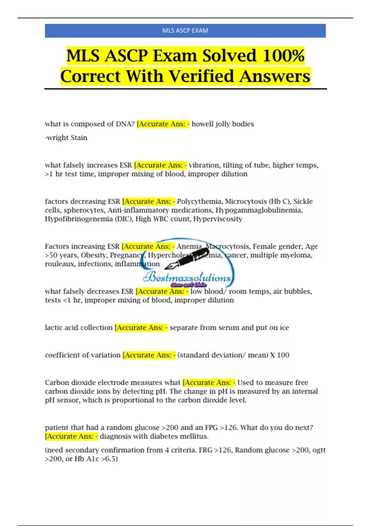 MLS ASCP Exam Solved 100% Correct With Verified Answers what is composed of DNA? [Accurate Ans: - howell jolly bodies -wright Stain what falsely increases ESR [Accurate Ans: - vibration, tilting of tube, higher temps, >1 hr test time, improper mixing of blood, improper dilution factors decreasing ESR [Accurate Ans: - Polycythemia, Microcytosis (Hb C), Sickle cells, spherocytes, Anti-inflammatory medications, Hypogammaglobulinemia, Hypofibrinogenemia (DIC), High WBC count, Hyperviscosity Factors increasing ESR [Accurate Ans: - Anemia, Macrocytosis, Female gender, Age >50 years, Obesity, Pregnancy, Hypercholesterolemia, cancer, multiple myeloma, rouleaux, infections, inflammation what falsely decreases ESR [Accurate Ans: - low blood/ room temps, air bubbles, tests <1 hr, improper mixing of blood, improper dilution lactic acid collection [Accurate Ans: - separate from serum and put on ice coefficient of variation [Accurate Ans: - (standard deviation/ mean) X 100