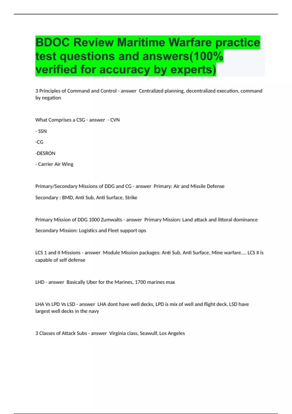 DOC Review Maritime Warfare practice test questions and answers(100% verified for accuracy)