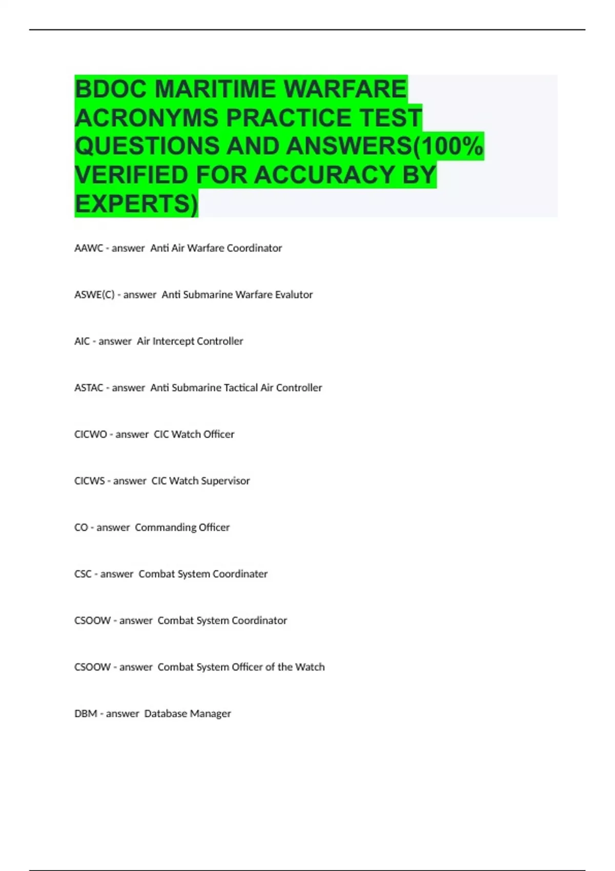 BDOC MARITIME WARFARE ACRONYMS PRACTICE TEST QUESTIONS AND ANSWERS(100% VERIFIED FOR ACCURACY)