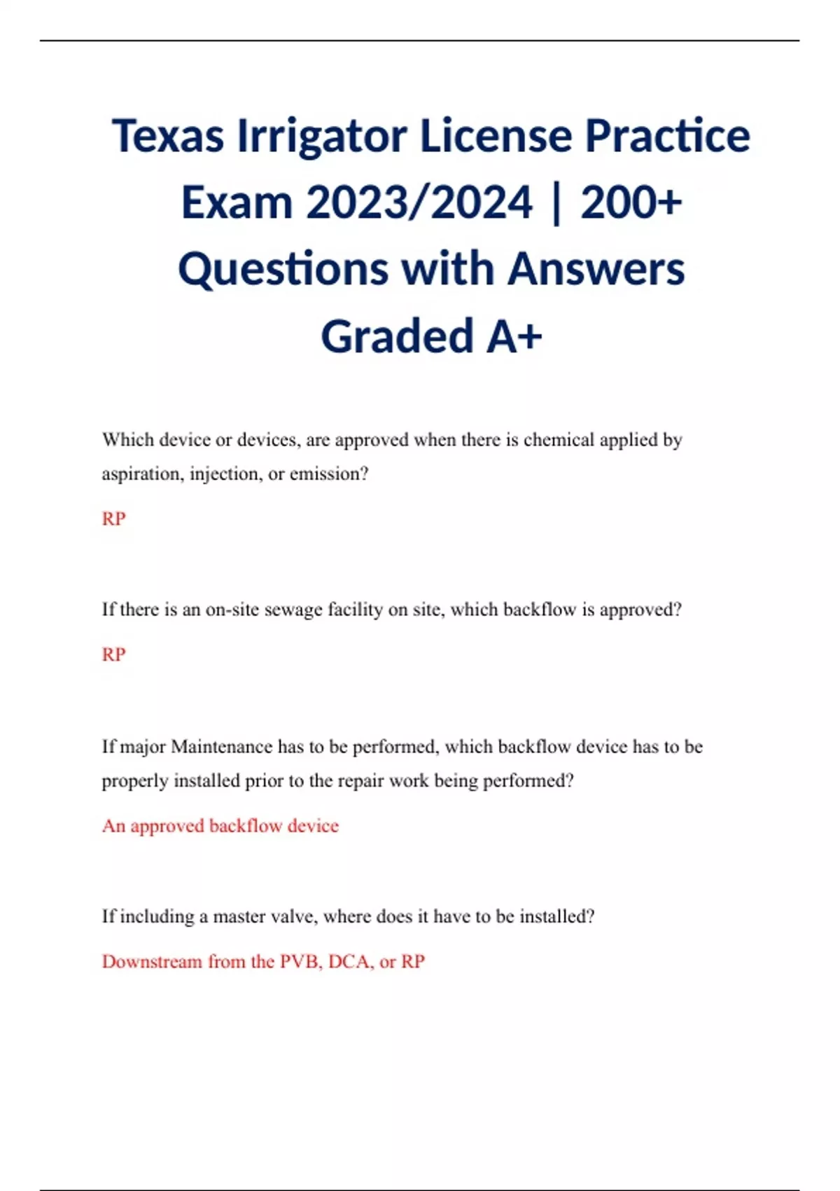 Texas Irrigator License Practice Exam 2023/2024 | 200+ Questions with Answers Graded A+