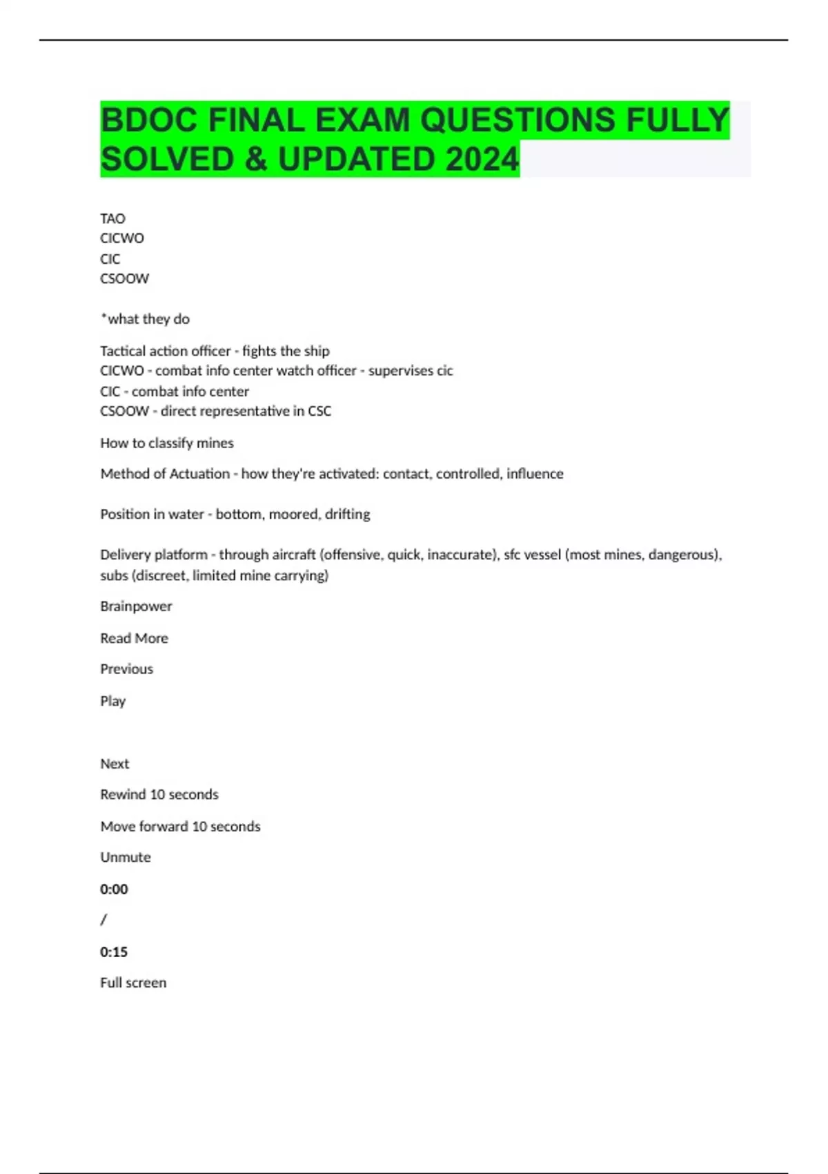 TAO CICWO CIC CSOOW *what they do Tactical action officer - fights the ship CICWO - combat info center watch officer - supervises cic CIC - combat info center CSOOW - direct representative in CSC How to classify mines Method of Actuation - how they're activated: contact, controlled, influence Position in water - bottom, moored, drifting Delivery platform - through aircraft (offensive, quick, inaccurate), sfc vessel (most mines, dangerous), subs (discreet, limited mine carrying) 6 Ways to Show Appreciation for Your Child's Teacher Previous Play Next Rewind 10 seconds Move forward 10 seconds Unmute 0:02 / 0:54 Full screen Guard Cover Copy Listen Listen, ready to transmit and logging all transmissions Listen, not ready to transmit and logging all transmissions listen, keep log of all transmissions listen, log required on transmissions Unsecure Net Secure Net red, unencrypted green, encrypted VBSS team positions and responsibilities MIO - maritime interception operations Phases: 1) detection/surveillance 2) query and approach 3) board and search 4) debarkation 5) post-boarding VBSS - maritime boarding actions and tactics Team: 7 personnel trained to conduct non-compliant boarding 3 boarding officers - OTC of boarding team 2 breachers 2 rhib crews Link 11 and Link 16 Link 11 requirements: -List of primary and secondary frequencies -Net control station -Grid reference unit -Initial Data link reference point -Picket units Link 16 adv: -Frequency hopping (reduces jamming) -TDMA -Nodeless Adv and disadvantages of sonar (passive and active) Active advantages: -good against diesel threats -rapid, pinpointed position of target -obtain course and speed Active disadvantages: -extremely overt -rules of engagement may be an issue (because you don't get their frequency) -false targets ***Active gives you bearing, range, speed, and course Passive adv: -Covert -long detection ranges Passive disadvantages: -bearing error -lengthy TMA (target motion analysis) ***Passive gives you bearing and frequency Threat levels: Red Yellow White Red - attack is imminent Yellow - attack is probable White - attack is unlikely without warning Cease fire hold fire weapons free, tight, safe Cease - stop firing, missiles in air can continue tracking Hold - stop firing, missiles in air blow up Weapons free - fire on anything not friendly Weapons tight - fire on anything hostile Weapons safe - don't fire unless directed to 3-A table (entire thing) Ship's pilot info card (length, beam, draft, air draft, distance from bow to pelorus, power plant, horsepower, # of shafts, direction of shaft rotation, fixed pitch, # rudders, max speed) Discharge table Unrep flags ... TLAM variants: III C III D IV E C - unitary warhead, 900 nm range, subsonic and not reprogrammable D - bomblets, 700 nm range, not reprogrammable E - unitary, 900 nm range, reprogrammablej TLAM Internal watchstanders: DBM ECO MM EM DBM - manages GCCS-M ECO - directs TLAM ops in the CIC MM - loads TLAM missions in the correct missiles EM - responsible for creating the TLAM flight path from ship to FPPWP Electronic warfare - deception methods manipulation - eliminate revealing/convey misleading EM indicators simulation - simulate friendly, notional, or actual capabilities imitation - imitate enemy emissions JEZ, FEZ, MEZ JEZ is hardest to coordinate and therefore last resort Speed of sound in water temp, salinity, pressure *Any increase in any one will increase sound speed List of watchstanders and who they work under (which coordinators, like AAWC, ASWE, etc) AAWC: -MSS -AIC -RCS -RSC -EWS -EW -IDS/TIC EWS: -EWO -SSES ECO: -EM -DBM -MM ASWE: -UB -CADRT -ASTAC -ASWE -SONAR SUPE SUWC: -GUNS -GLO -HEP -NSSC -SWS -RCS -EWS -UB CIC main ideas (GPDED) gather process display evaluate disseminate EMCON RMP, 3rd party targeting (over the horizon targeting) EMCON ship is invisible, 3rd party ship is more vulnerable Phases of surface action Prepare Detect Long range engagement Short range engagement Damage control MOPP levels 0 1 2 3 4 0 - normal operating conditions 1 - suspect a CBR-N attack 2- attack is possible, must have mask ready, countermeasure washdown completed, SET MODIFIED ZEBRA, ensure CPS zones are airlocked 3 - CBR-N attack probable, go to GQ and condition zebra 4 - Attack imminent, set Circle William Ranges and sizes of each fire extinguisher PKP CO2 AFFF PKP: -class bravo -breaks up combustion chain reaction -18 and 27 lbs -discharge 10/11 sec -19-21 ft CO2: -class Charlie -displaces oxygen -15 lbs -steel casing = 35 sec -aluminum casing = 15 sec -4-6 ft AFFF: -class bravo -creates vapor barrier and cools -28 lb size -45 to 65 sec discharge -10 ft SCBA 30 min 45 min Rated to 4500 psi Team compositions for Rapid response in port/underway In port: -duty fire marshal -duty electrician -advanced dc qualified person Underway: -ship's fire marshal -ship's electrician -advanced dc qualified person Loops for firemain Horizontal Vertical Vertical offset Composite Identify what everything means on a bullseye (including the compartment letters) Ex. Frame is: 3-202-0-L FR202-210 S-5 Ex. Frame is: 3-202-0-L FR202-210 S-5 -Deck number (3) -Forward most frame (202) - starts at 1 on bow, 0 is center -Position in relation to the centerline (PESO - port even, starboard odd, 0 center) -Compartment use (L) -Frame range: forward most frame to after most frame (202 - 210) -Division and workcenter responsible Compartment Letters A - stowage spaces C - ship control E - machinery spaces normally manned F - oil stowage compartments G - gasoline J - JP5 tanks K - chemical/dangerous material L - living spaces M - ammunition spaces Q - misc. spaces T - vertical access trucks V - void compartments
