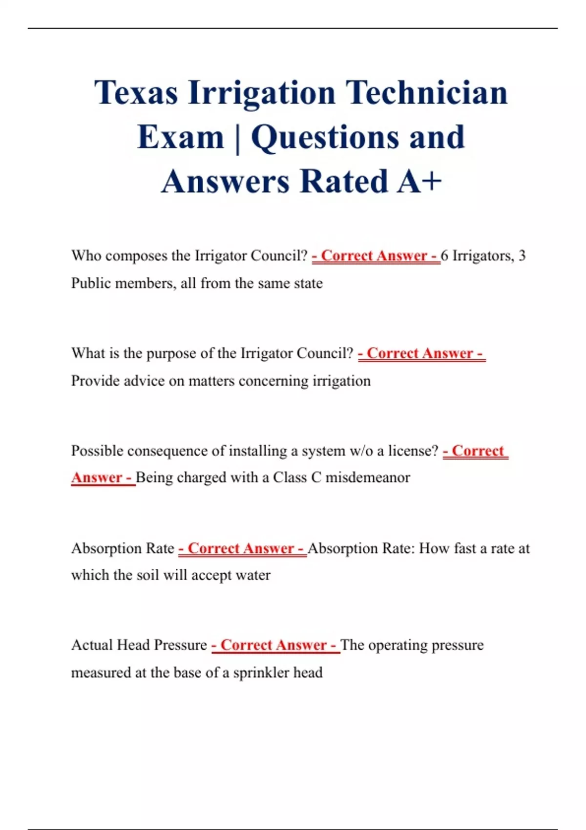 Texas Irrigation Technician Exam | Questions and Answers Rated A+ Texas Irrigation Technician Exam | Questions and Answers Rated A+ Texas Irrigation Technician Exam | Questions and Answers Rated A+