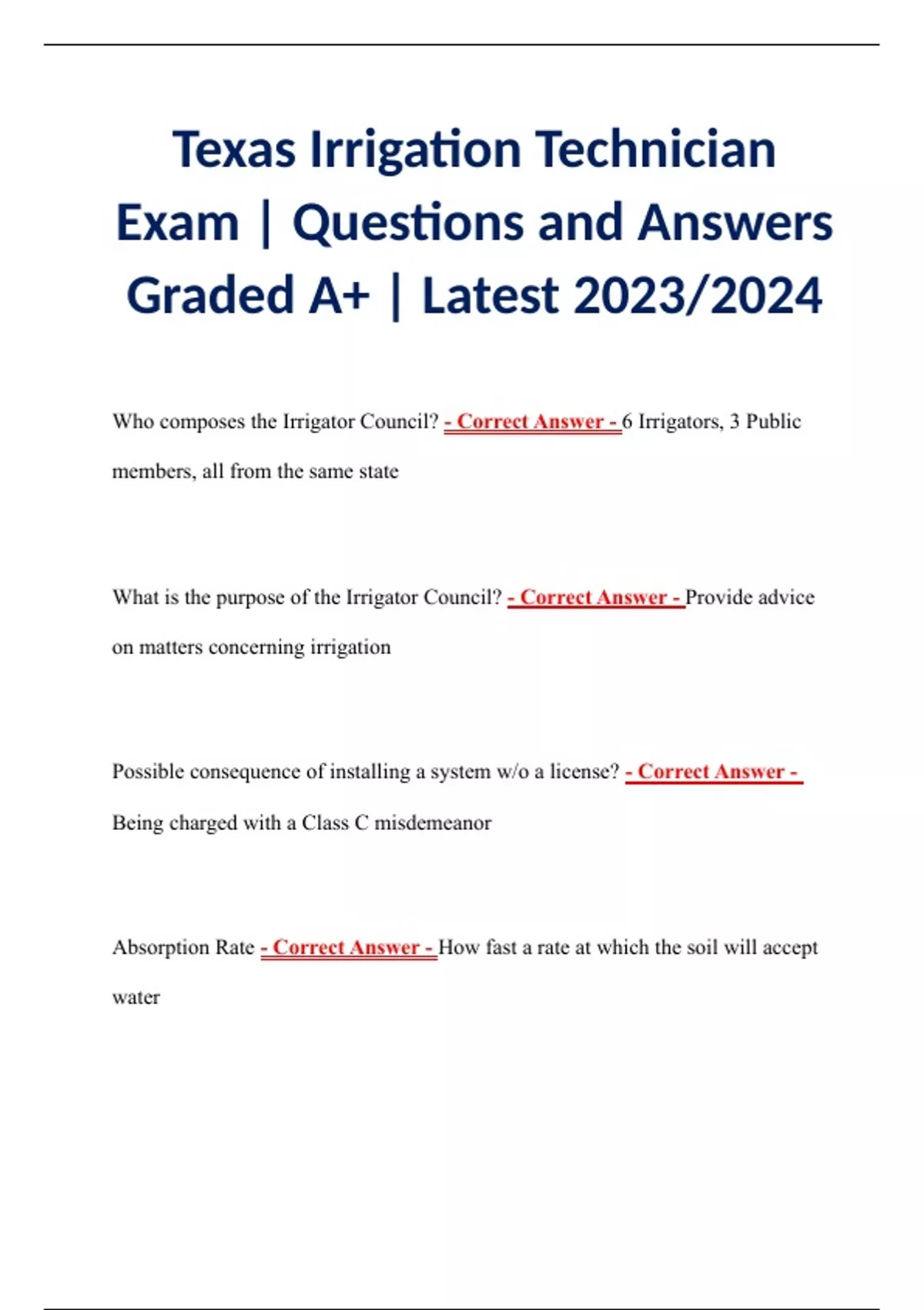 Texas Irrigation Technician Exam | Questions and Answers Graded A+ | Latest 2023/2024 Texas Irrigation Technician Exam | Questions and Answers Graded A+ | Latest 2023/2024 Texas Irrigation Technician Exam | Questions and Answers Graded A+ | Latest 2023/2024