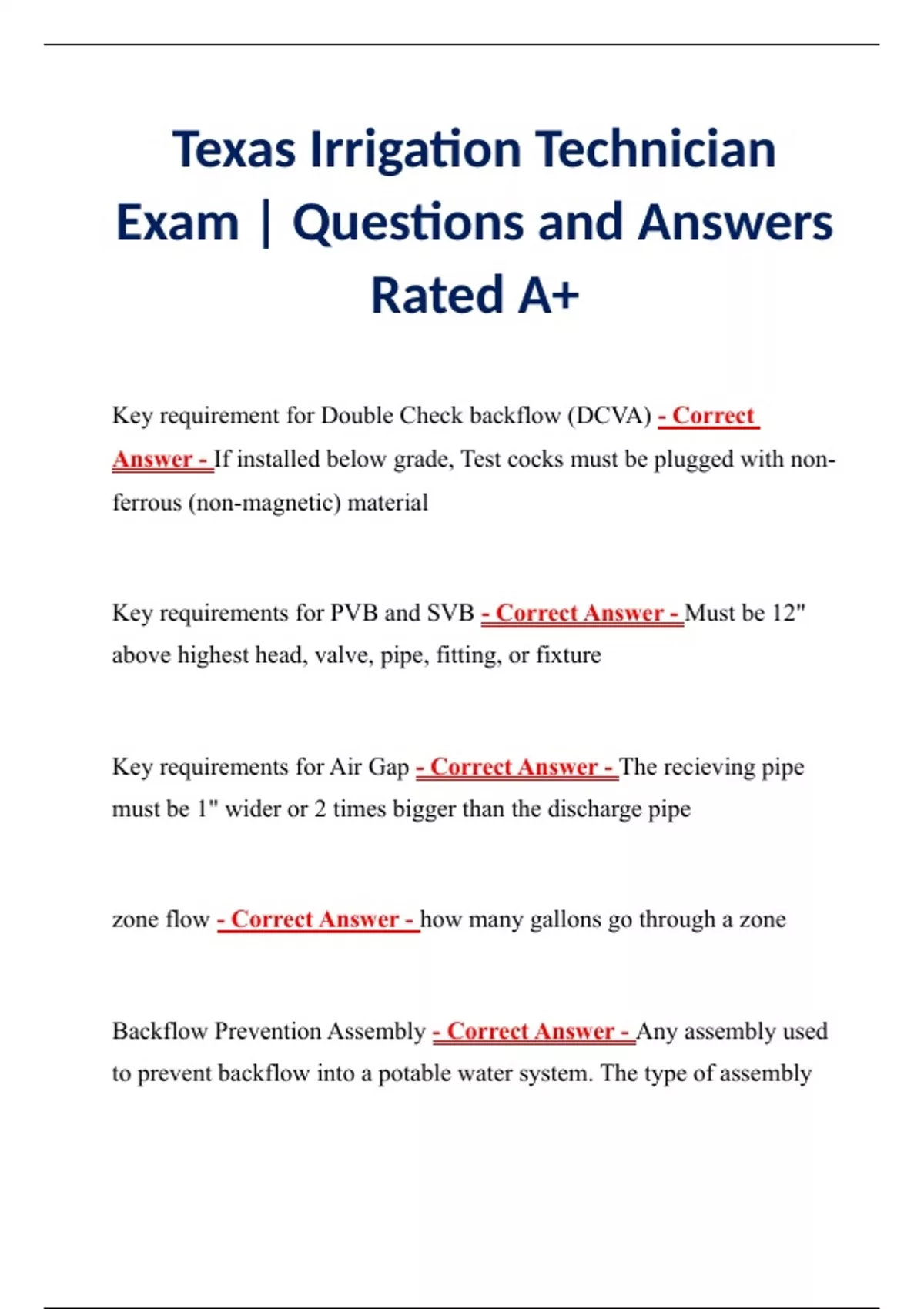 Texas Irrigation Technician Exam | Questions and Answers Rated A+ Texas Irrigation Technician Exam | Questions and Answers Rated A+ Texas Irrigation Technician Exam | Questions and Answers Rated A+