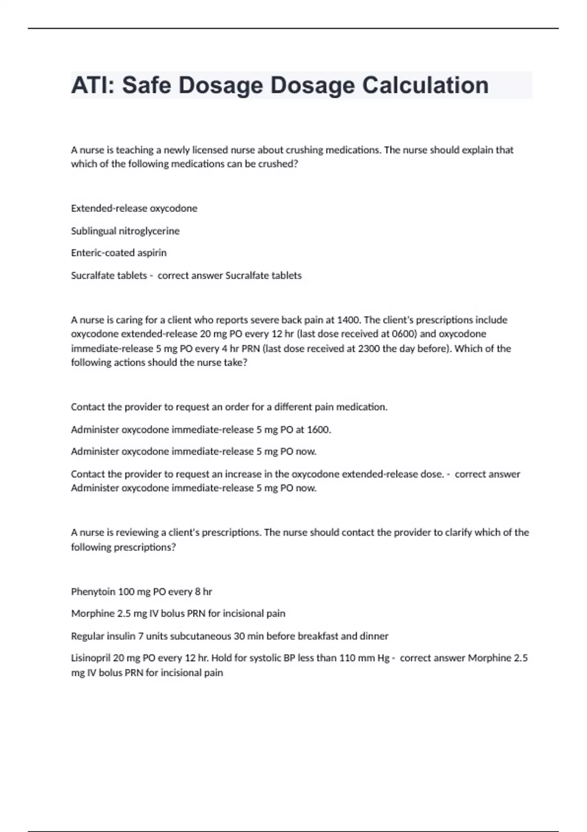 ATI: Safe Dosage Dosage CalculationA nurse is teaching a newly licensed nurse about crushing medications. The nurse should explain that which of the following medications can be crushed? Extended-release oxycodone Sublingual nitroglycerine Enteric-coated aspirin Sucralfate tablets - correct answer Sucralfate tablets A nurse is caring for a client who reports severe back pain at 1400. The client's prescriptions include oxycodone extended-release 20 mg PO every 12 hr (last dose received at 0600) and oxycodone immediate-release 5 mg PO every 4 hr PRN (last dose received at 2300 the day before). Which of the following actions should the nurse take? Contact the provider to request an order for a different pain medication. Administer oxycodone immediate-release 5 mg PO at 1600. Administer oxycodone immediate-release 5 mg PO now. Contact the provider to request an increase in the oxycodone extended-release dose. - correct answer Administer oxycodone immediate-release 5 mg PO now. A nurse is reviewing a client's prescriptions. The nurse should contact the provider to clarify which of the following prescriptions? Phenytoin 100 mg PO every 8 hr Morphine 2.5 mg IV bolus PRN for incisional pain Regular insulin 7 units subcutaneous 30 min before breakfast and dinner Lisinopril 20 mg PO every 12 hr. Hold for systolic BP less than 110 mm Hg - correct answer Morphine 2.5 mg IV bolus PRN for incisional pain