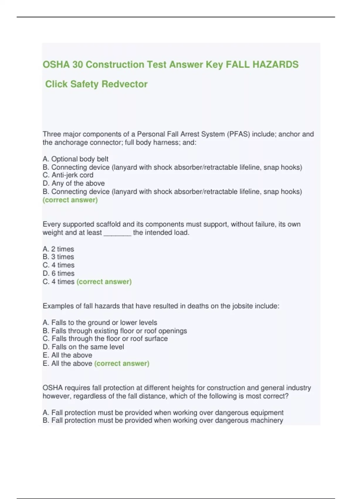 OSHA 30 Construction Test Answer Key FALL HAZARDS Click Safety Redvector