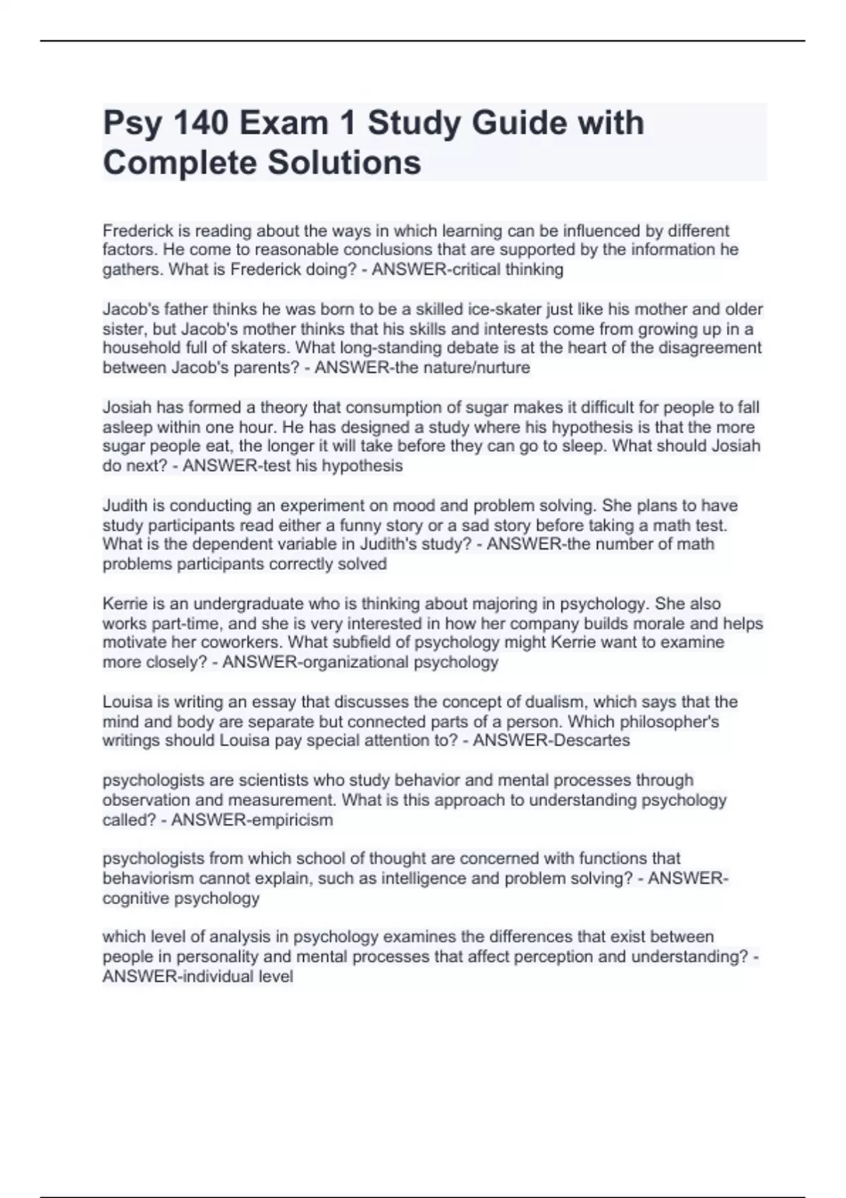 Psy 140 Exam 1 Study Guide with Complete SolutionsPsy 140 Exam 1 Study Guide with Complete SolutionsPsy 140 Exam 1 Study Guide with Complete SolutionsPsy 140 Exam 1 Study Guide with Complete Solutions Frederick is reading about the ways in which learning can be influenced by different factors. He come to reasonable conclusions that are supported by the information he gathers. What is Frederick doing? - ANSWER-critical thinking Jacob's father thinks he was born to be a skilled ice-skater just like his mother and older sister, but Jacob's mother thinks that his skills and interests come from growing up in a household full of skaters. What long-standing debate is at the heart of the disagreement between Jacob's parents? - ANSWER-the nature/nurture Josiah has formed a theory that consumption of sugar makes it difficult for people to fall asleep within one hour. He has designed a study where his hypothesis is that the more sugar people eat, the longer it will take before they can go to sleep. What should Josiah do next? - ANSWER-test his hypothesis