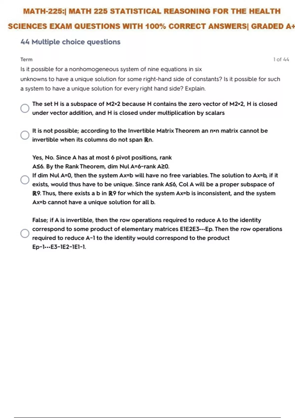 MATH-225:| MATH 225 STATISTICAL REASONING FOR THE HEALTH SCIENCES SELF TEST 10 QUESTIONS WITH 100% CORRECT ANSWERS| GRADED A+