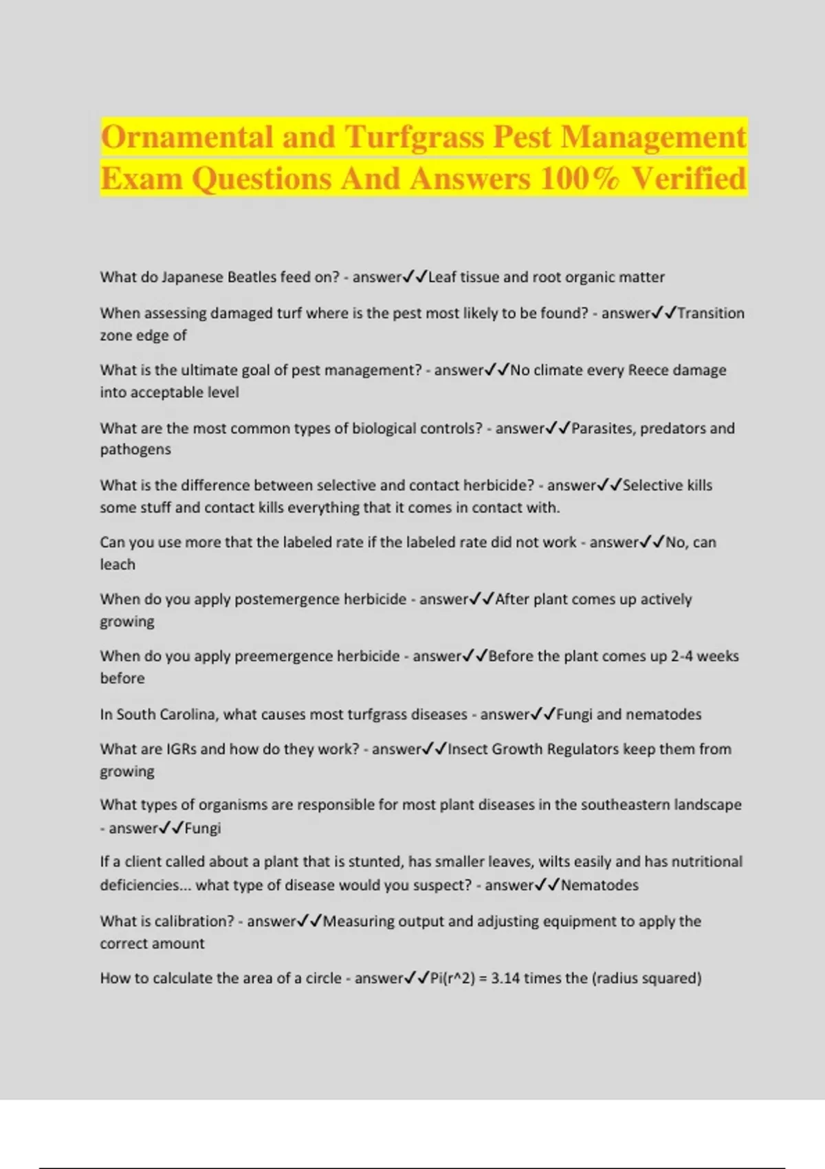 Ornamental and Turfgrass Pest Management Exam Questions And Answers 100% Verified What do Japanese Beatles feed on? - answerLeaf tissue and root organic matter When assessing damaged turf where is the pest most likely to be found? - answerTransition zone edge of What is the ultimate goal of pest management? - answerNo climate every Reece damage into acceptable level What are the most common types of biological controls? - answerParasites, predators and pathogens What is the difference between selective and contact herbicide? - answerSelective kills some stuff and contact kills everything that it comes in contact with. Can you use more that the labeled rate if the labeled rate did not work - answerNo, can leach When do you apply postemergence herbicide - answerAfter plant comes up actively growing When do you apply preemergence herbicide - answerBefore the plant comes up 2-4 weeks befor