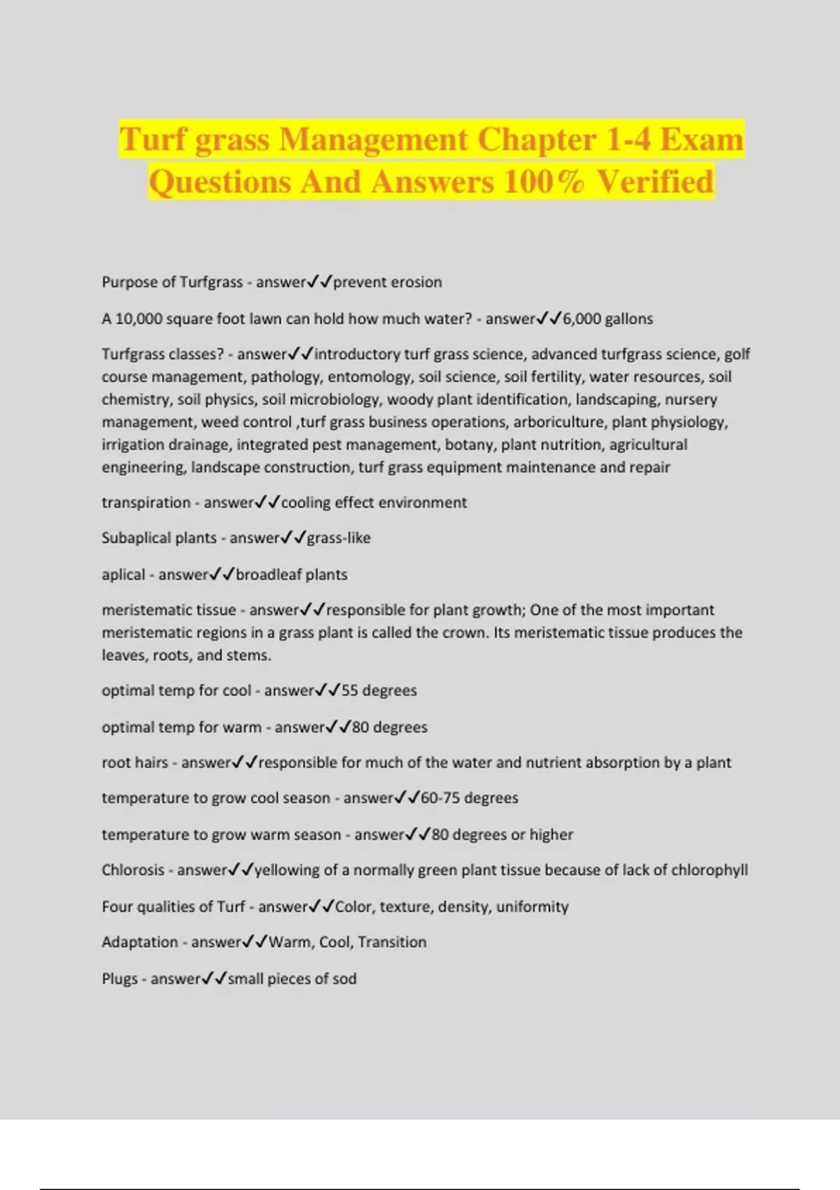 Turf grass Management Chapter 1-4 Exam Questions And Answers 100% Verified Purpose of Turfgrass - answerprevent erosion A 10,000 square foot lawn can hold how much water? - answer6,000 gallons Turfgrass classes? - answerintroductory turf grass science, advanced turfgrass science, golf course management, pathology, entomology, soil science, soil fertility, water resources, soil chemistry, soil physics, soil microbiology, woody plant identification, landscaping, nursery management, weed control ,turf grass business operations, arboriculture, plant physiology, irrigation drainage, integrated pest management, botany, plant nutrition, agricultural engineering, landscape construction, turf grass equipment maintenance and repair transpiration - answercooling effect environment Subaplical plants - answergrass-like aplical - answerbroadleaf plants meristematic tissue - answerresponsible for plant growth; One of the most important meristematic regions in a grass plant is called the crown. Its meristematic tissue produces the leaves, roots, and stems. optimal temp for cool - answer55 degrees optimal temp for warm - answer80 degrees root hairs - answerresponsible for much of the water and nutrient absorption by a plant temperature to grow cool season - answer60-75 degrees temperature to grow warm season - answer80 degrees or higher Chlorosis - answeryellowing of a normally green plant tissue because of lack of chlorophyll Four qualities of Turf - answerColor, texture, density, uniformity Adaptation - answerWarm, Cool, Transition Plugs - answersmall pieces of sod sprigs - answerpieces of stolons Sod - answerThin strips of turf grass and soil