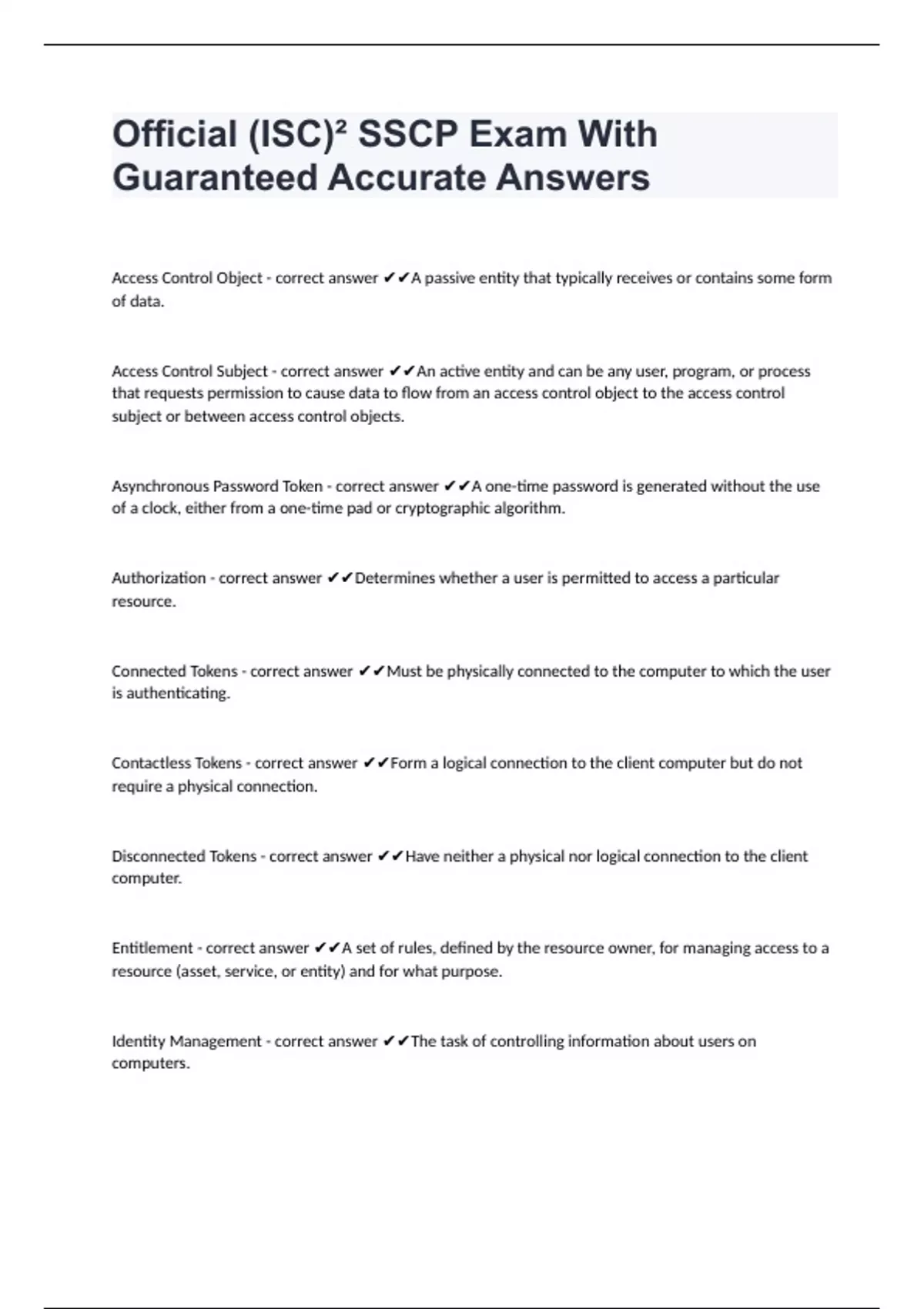 Access Control Object - correct answer A passive entity that typically receives or contains some form of data. Access Control Subject - correct answer An active entity and can be any user, program, or process that requests permission to cause data to flow from an access control object to the access control subject or between access control objects. Asynchronous Password Token - correct answer A one-time password is generated without the use of a clock, either from a one-time pad or cryptographic algorithm. Authorization - correct answer Determines whether a user is permitted to access a particular resource. Connected Tokens - correct answer Must be physically connected to the computer to which the user is authenticating.