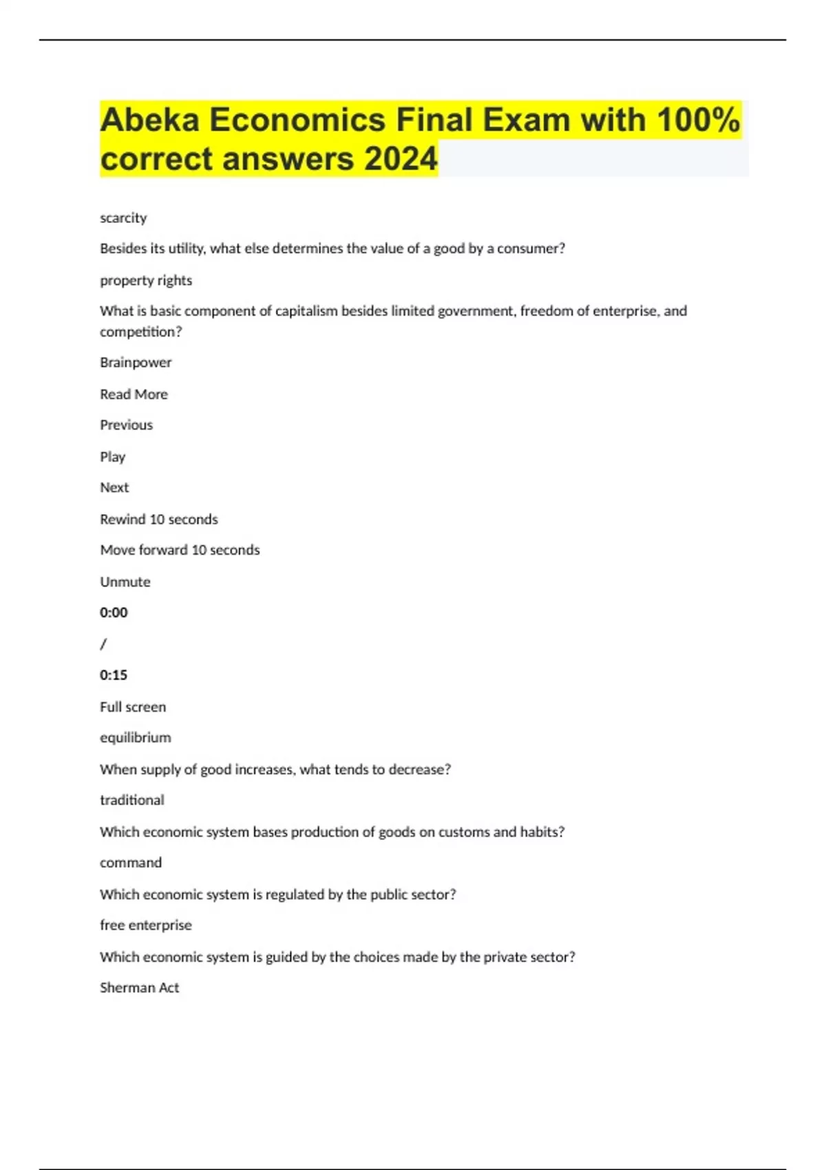 scarcity Besides its utility, what else determines the value of a good by a consumer? property rights What is basic component of capitalism besides limited government, freedom of enterprise, and competition? Brainpower Read More Previous Play Next Rewind 10 seconds Move forward 10 seconds Unmute 0:00 / 0:15 Full screen equilibrium When supply of good increases, what tends to decrease? traditional Which economic system bases production of goods on customs and habits? command Which economic system is regulated by the public sector? free enterprise Which economic system is guided by the choices made by the private sector? Sherman Act What was one of the first antitrust laws enacted in the United States? total cost What is the sum cost of all the factors of production used in making goods? standardized parts Besides division of labor and automatic conveyance, what composes the "American system" of mass production? transaction account A checking account is what type of account? CD What type of account guarantees a certain interest rate and has a specified maturity date? measure of value What function of money allows people to compare the worth of one good with that of another good? GDP What is the value of all finished goods and services produced within a country during a year's time? oligopoly What type of market model is dominated by only a few firms? monopolistic competition What type of market model provides differentiated products? perfect competition What type of market model results in firms that are price takers? monopoly What type of market model results when there is only one supplier of a good for which there is no substitute? bonds What is one of the safest ways to invest in a corporation? NAFTA What agreement among the United States, Canada, and Mexico encouraged free trade encouraged? WTO What organization holds a policy of "most-favoured nation"? IMF What was originally established to monitor currency exchange? legal What type of monopoly is a copyright on a novel? capital What type of good is an oven used to bake bread in a bakery? demand What is the relationship between a good's price and the amount that people are willing to buy? surplus What usually results when a govern