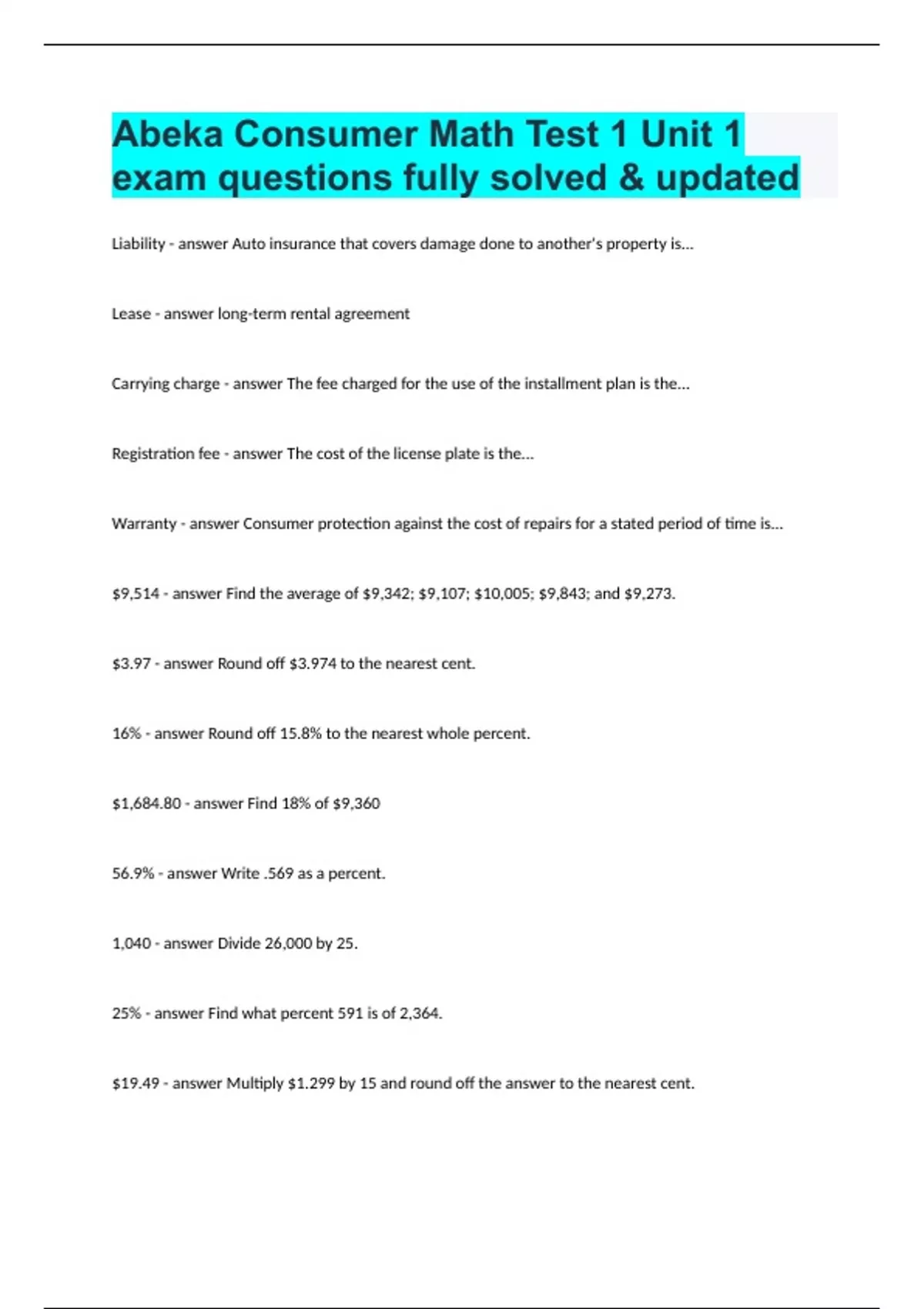 Abeka Consumer Math Test 1 Unit 1 exam questions fully solved & updated