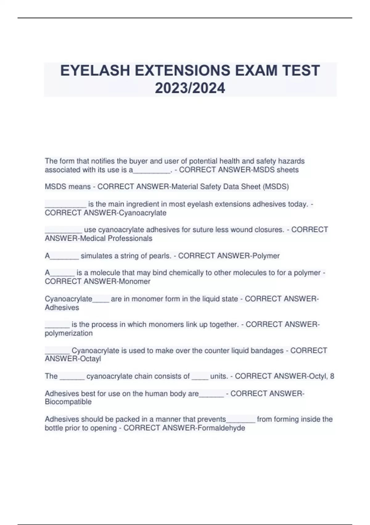 EYELASH EXTENSIONS EXAM TEST 2023/2024 The form that notifies the buyer and user of potential health and safety hazards associated with its use is a_________. - CORRECT ANSWER-MSDS sheets MSDS means - CORRECT ANSWER-Material Safety Data Sheet (MSDS) __________ is the main ingredient in most eyelash extensions adhesives today. - CORRECT ANSWER-Cyanoacrylate _________ use cyanoacrylate adhesives for suture less wound closures. - CORRECT ANSWER-Medical Professionals A_______ simulates a string of pearls. - CORRECT ANSWER-Polymer A______ is a molecule that may bind chemically to other molecules to for a polymer - CORRECT ANSWER-Monomer Cyanoacrylate____ are in monomer form in the liquid state - CORRECT ANSWERAdhesives ______ is the process in which monomers link up together. - CORRECT ANSWERpolymerization ______ Cyanoacrylate is used to make over the counter liquid bandages - CORRECT ANSWER-Octayl The ______ cyanoacrylate chain consists of ____ units. - CORRECT ANSWER-Octyl, 8 Adhesives best for use on the human body are______ - CORRECT ANSWERBiocompatible Adhesives should be packed in a manner that prevents_______ from forming inside the bottle prior to opening - CORRECT ANSWER-Formaldehyde New adhesives are stronger, more flexible, more concentrated and rely on_______ monomers. - CORRECT ANSWER-Elastomeric short- chain __________ adhesives are capable of being stretched, twisted or squeezed - CORRECT ANSWER-Elastomeric Touch-ups are called_______ - CORRECT ANSWER-Refills The method to fix lashes that lift and detach at the base are referred to as _______ - CORRECT ANSWER-Cleaning up method The ______ allows you to remove a single poorly bonded, lifting or undesirable extension - CORRECT ANSWER-Alternative Method The ______ is performed by taking two lashes and pulling them gently apart from one another with tweezers - CORRECT ANSWER-Alternative technique ____ is the twist and peel technique. - CORRECT ANSWER-Dry Removal ______ is what clients desire. - CORRECT ANSWER-Longevity The ______ always uses at least 3 lengths of extensions. - CORRECT ANSWER-Three Length Bonding Technique Anlagen, Catagen, and Telogen refer to the three phases of the natural eyelash _______ - CORRECT ANSWER-Growth Cycle Using ______ length across the lash line can look artificial, tangle and look less thick - CORRECT ANSWER-One Longer extensions tend to _____ and _____ without the support of shorter lashes in between. - CORRECT ANSWER-Tangle and Twist When Lashing the Extensionist should sit ______ the client order to see the lash follicle. - CORRECT ANSWER-Close to Each growth phase accounts for ____ % of the lashes on the eye. - CORRECT ANSWER-30 The best application is to apply to _____ lash visible - CORRECT ANSWER-Every Extensionists should practice good________ to prevent fatigue and injury. - CORRECT ANSWER-Posture Applying lashes after a client has worn their lashes for a few weeks is called a ______. - CORRECT ANSWER-Fill The natural client will wear lashes in place of _____. - CORRECT ANSWER-Make-up A natural client may wear lashes because she has_______. - CORRECT ANSWERAllergies An economical way to advertise may include ________. - CORRECT ANSWER-Online Social Marketing This is the best time to build a ______ for lash extensions because the market is wide open. - CORRECT ANSWER-Clientele A glamorous client wears lashes for ______ and attention because it gives a somewhat ________. - CORRECT ANSWER-Length, artificial look An eyelash Extension Specialist must plan_______. - CORRECT ANSWER-Practice Time Eyelash Extensionist who frequently practice improve_____ and ______. - CORRECT ANSWER-Education, Hands-On and Accuracy The best outreach and advertising is _____ and ______. - CORRECT ANSWER-Word of Mouth and referrals Everyone is a potential______. - CORRECT ANSWER-Client. The top 4 things and Eyelash Extension Specialist can do to improve their business are ____, ____,_____ and ______. - CORRECT ANSWER-Quality work, knowledge, sanitation and timing _____ enhance the eyes dramatically. - CORRECT ANSWER-Lash Extensions Eyelash Extensions Specialists chose only _____ length of extensions and attached a few shorter ones in the inner and outer corners. - CORRECT ANSWER-1 The first technique used only one_____ for all extensions. - CORRECT ANSWERDiameter Early lash styles were almost_______. - CORRECT ANSWER-Undetectable The ______begins with applying tape or other _______ to the skin below the eye. - CORRECT ANSWER-Korean method, separating membrane ______ is used on clients with naturally watery eyes, high cheekbones and oily skin. - CORRECT ANSWER-Tape