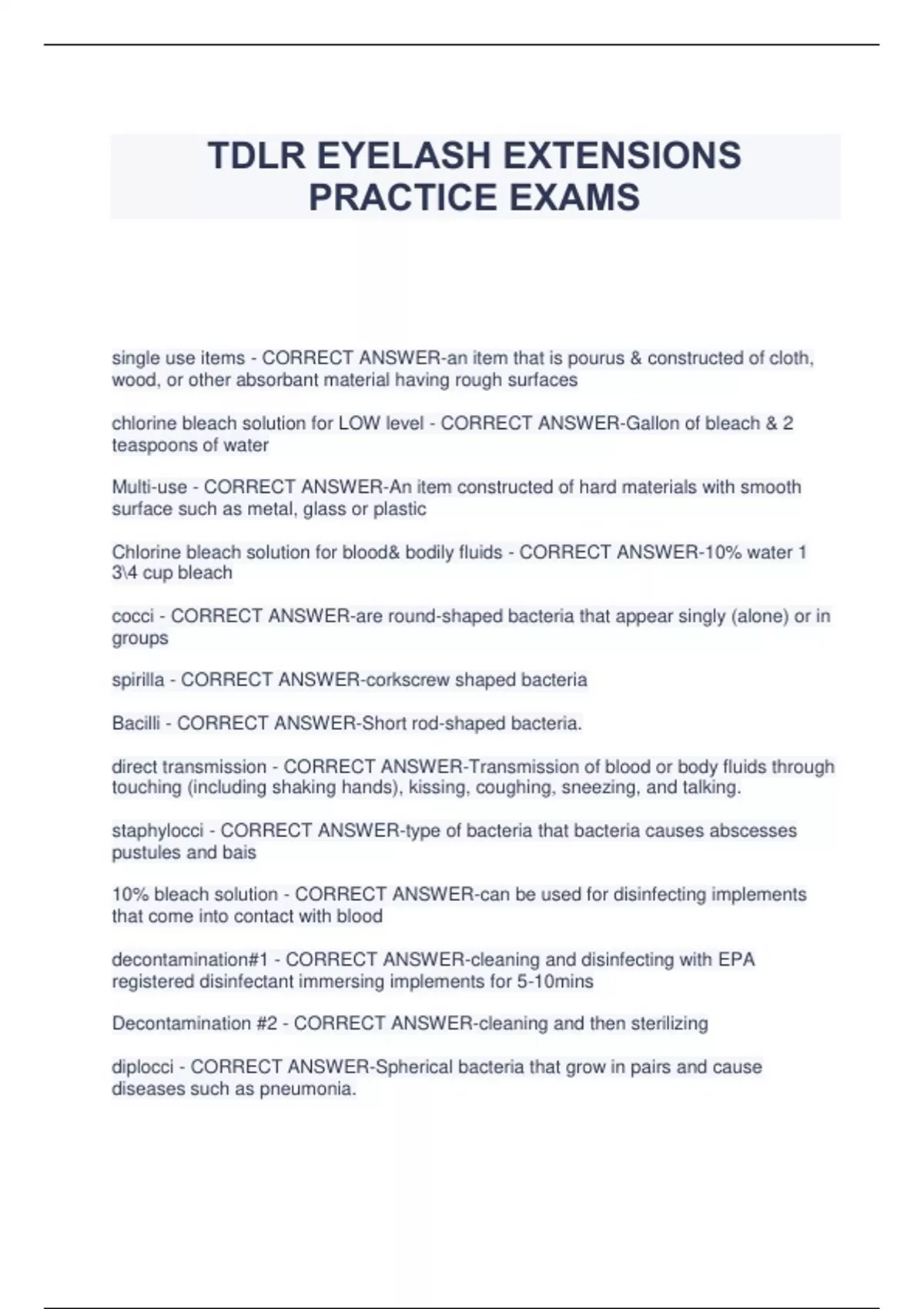 TDLR EYELASH EXTENSIONS PRACTICE EXAMS single use items - CORRECT ANSWER-an item that is pourus & constructed of cloth, wood, or other absorbant material having rough surfaces chlorine bleach solution for LOW level - CORRECT ANSWER-Gallon of bleach & 2 teaspoons of water Multi-use - CORRECT ANSWER-An item constructed of hard materials with smooth surface such as metal, glass or plastic Chlorine bleach solution for blood& bodily fluids - CORRECT ANSWER-10% water 1 34 cup bleach cocci - CORRECT ANSWER-are round-shaped bacteria that appear singly (alone) or in groups spirilla - CORRECT ANSWER-corkscrew shaped bacteria Bacilli - CORRECT ANSWER-Short rod-shaped bacteria. direct transmission - CORRECT ANSWER-Transmission of blood or body fluids through touching (including shaking hands), kissing, coughing, sneezing, and talking. staphylocci - CORRECT ANSWER-type of bacteria that bacteria causes abscesses pustules and bais 10% bleach solution - CORRECT ANSWER-can be used for disinfecting implements that come into contact with blood decontamination#1 - CORRECT ANSWER-cleaning and disinfecting with EPA registered disinfectant immersing implements for 5-10mins Decontamination #2 - CORRECT ANSWER-cleaning and then sterilizing diplocci - CORRECT ANSWER-Spherical bacteria that grow in pairs and cause diseases such as pneumonia. Hepatitis - CORRECT ANSWER-disease marked by inflammation of the liver and caused by a bloodbourne virus HIV - CORRECT ANSWER-human immunodeficiency virus Streptococci - CORRECT ANSWER-Pus-forming bacteria arranged in curved lines resembling a string of beads. They cause infections such as strep throat and blood poisoning. tuberculosis - CORRECT ANSWER-disease bacteria caused by transmitted through coughing or sneezing 2 most common eye shapes - CORRECT ANSWER-rounded or oblong (almond) anagen - CORRECT ANSWER-Active growing stage phase smallest finest & shortest hairs catagen - CORRECT ANSWER-end of the growing phase medium in length telogen - CORRECT ANSWER-final phase ready to shed lashes are the longest dark & course Blepharitis - CORRECT ANSWER-eyelids inflamed by redness and swelling & dried crust eyelash growth - CORRECT ANSWER-30-60 days rounded eyes - CORRECT ANSWER-add longer extensions to the outer corners of the eye almond eyes - CORRECT ANSWER-use longer extention to the center of the eye oblong - CORRECT ANSWER-use extra long eyelashes at the outer corners deep set - CORRECT ANSWER-slightly long and curlier extensions required square face shape - CORRECT ANSWER-use longer extensions near the middle of the eyes close-set eyes - CORRECT ANSWER-place extentions on the outer cornea of the eye round shape eye - CORRECT ANSWER-long extensions on the outer corners of the eye close set eyes - CORRECT ANSWER-eyes closer than one width apart