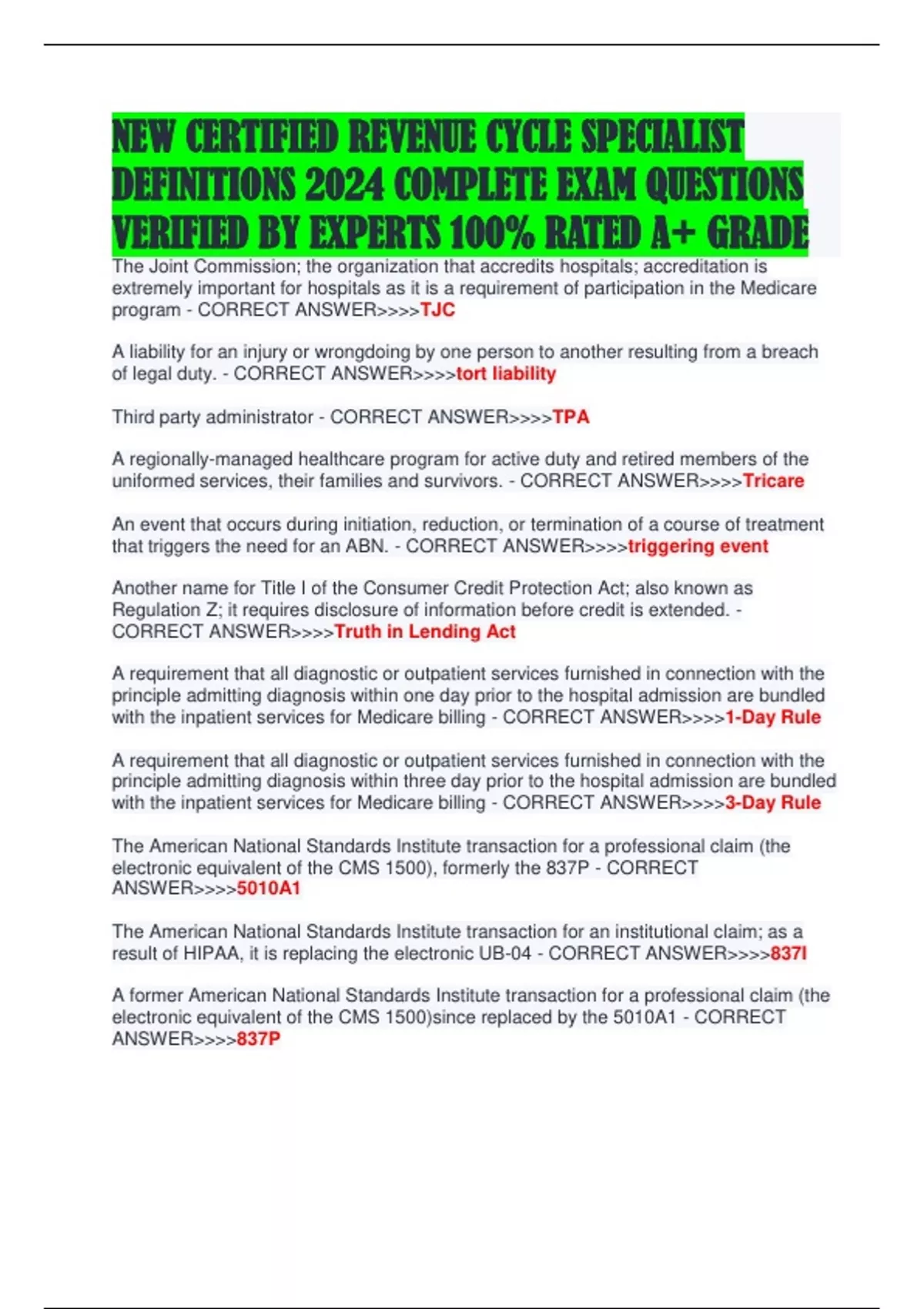 NEW CERTIFIED REVENUE CYCLE SPECIALIST DEFINITIONS 2024 COMPLETE EXAM QUESTIONS VERIFIED BY EXPERTS 100% RATED A+ GRADE