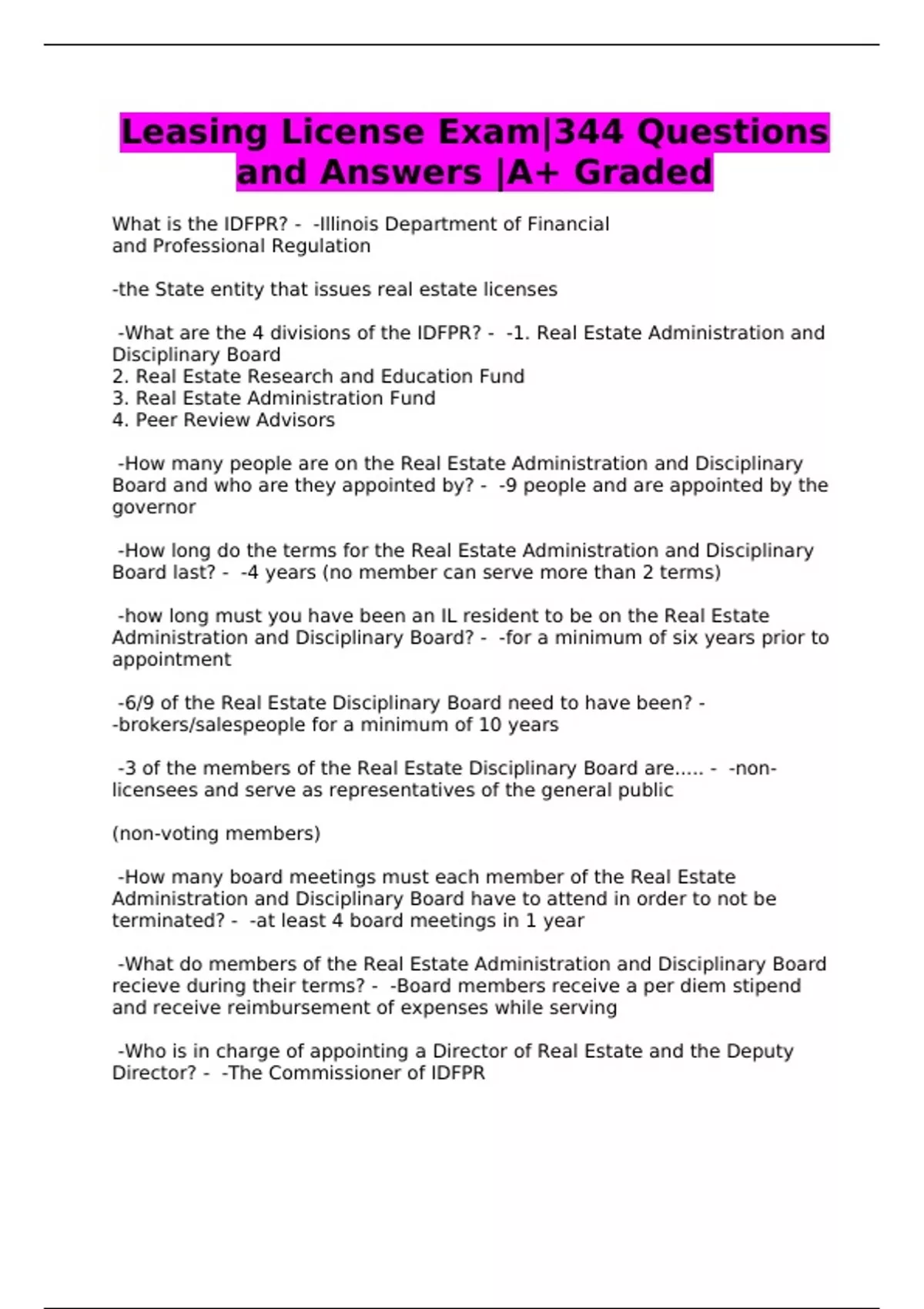 Leasing License Exam|344 Questions and Answers |A+ Graded