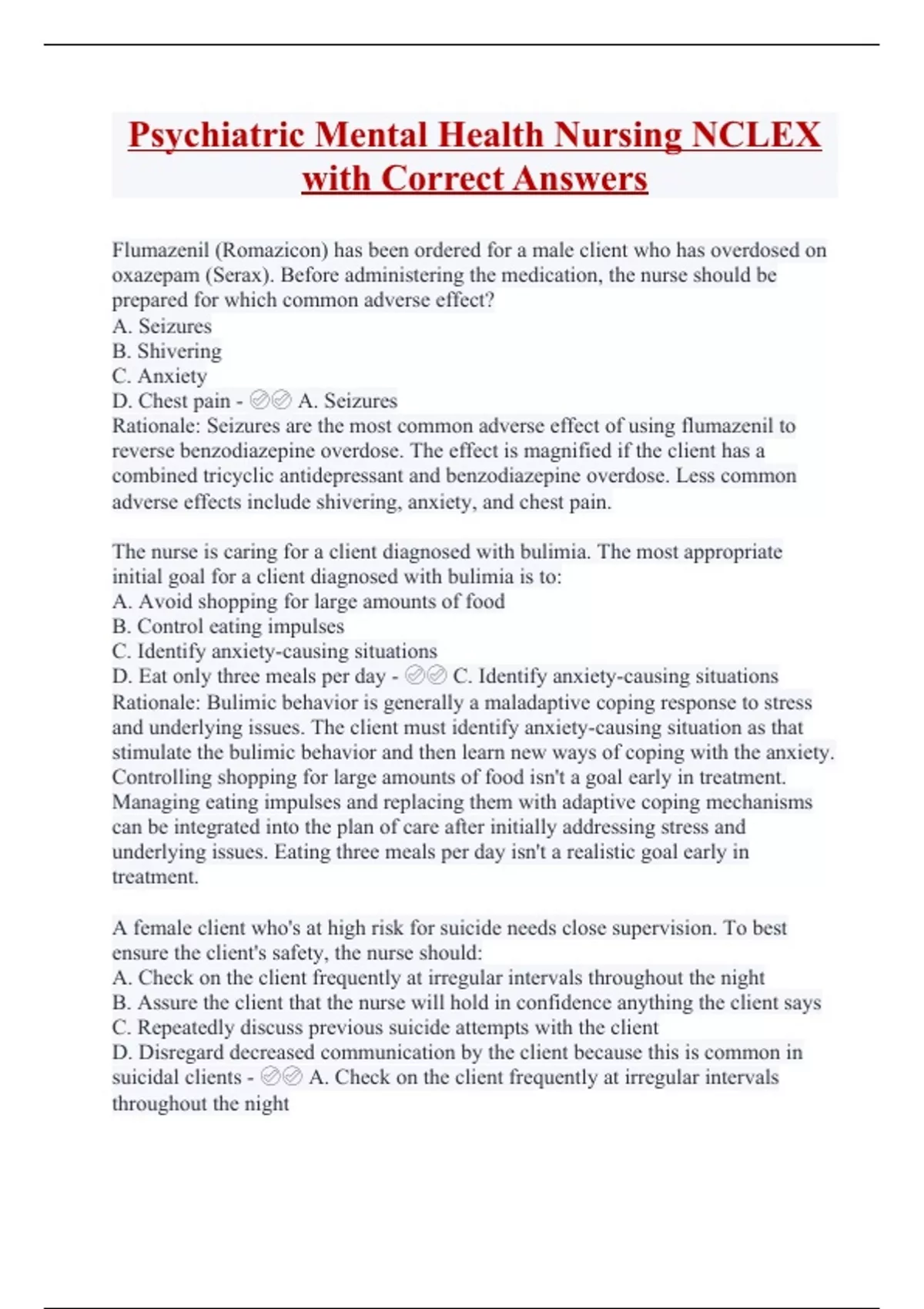 Psychiatric Mental Health Nursing NCLEX with Correct Answers