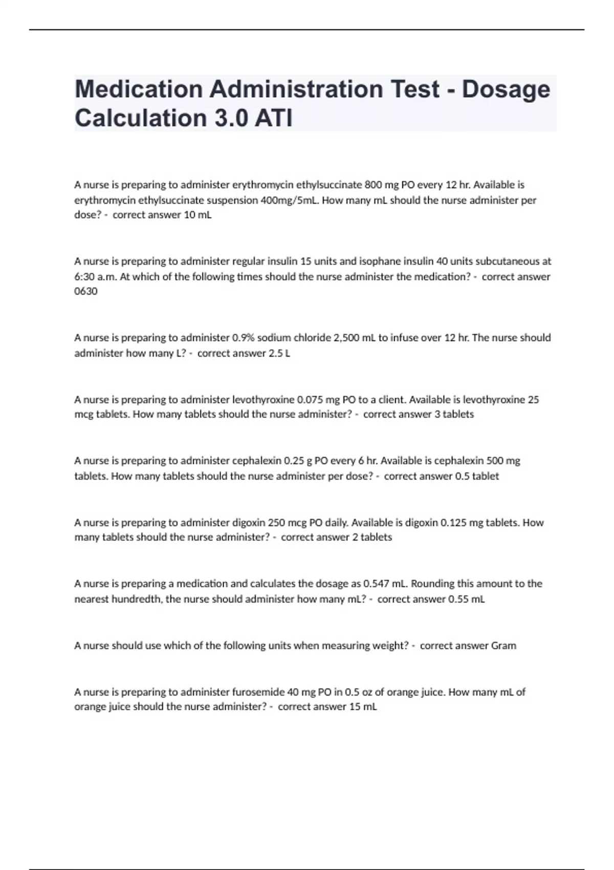 Medication Administration Test - Dosage Calculation 3.0 ATI well answered 100%