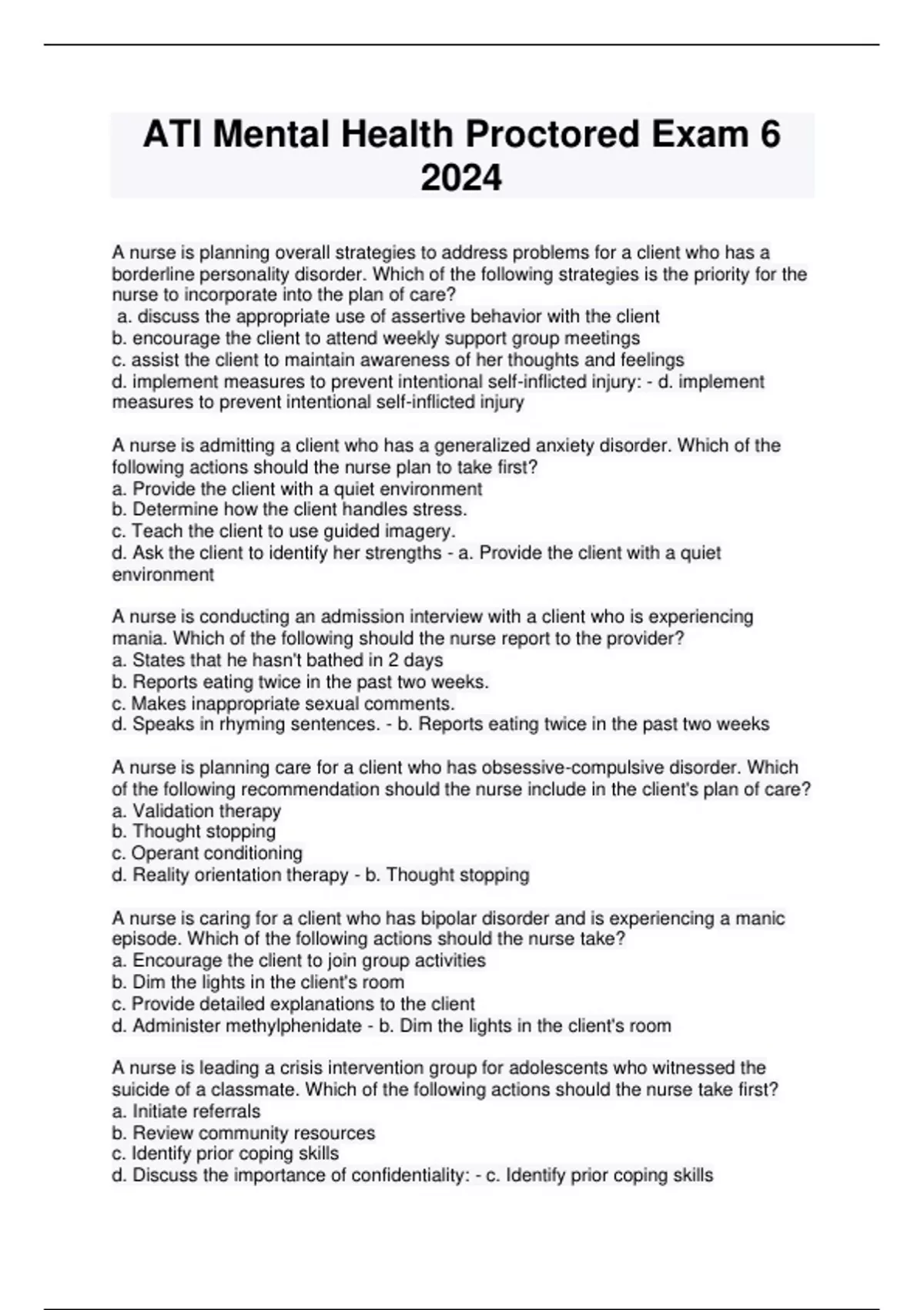 A nurse is planning overall strategies to address problems for a client who has a borderline personality disorder. Which of the following strategies is the priority for the nurse to incorporate into the plan of care? a. discuss the appropriate use of assertive behavior with the client b. encourage the client to attend weekly support group meetings c. assist the client to maintain awareness of her thoughts and feelings d. implement measures to prevent intentional self-inflicted injury: - d. implement measures to prevent intentional self-inflicted injury A nurse is admitting a client who has a generalized anxiety disorder. Which of the following actions should the nurse plan to take first? a. Provide the client with a quiet environment b. Determine how the client handles stress. c. Teach the client to use guided imagery. d. Ask the client to identify her strengths - a. Provide the client with a quiet environment A nurse is conducting an admission interview with a client who is experiencing mania. Which of the following should the nurse report to the provider? a. States that he hasn't bathed in 2 days b. Reports eating twice in the past two weeks. c. Makes inappropriate sexual comments. d. Speaks in rhyming sentences. - b. Reports eating twice in the past two weeks A nurse is planning care for a client who has obsessive-compulsive disorder. Which of the following recommendation should the nurse include in the client's plan of care? a. Validation therapy b. Thought stopping c. Operant conditioning d. Reality orientation therapy - b. Thought stopping A nurse is caring for a client who has bipolar disorder and is experiencing a manic episode. Which of the following actions should the nurse take? a. Encourage the client to join group activities b. Dim the lights in the client's room c. Provide detailed explanations to the client d. Administer methylphenidate - b. Dim the lights in the client's room A nurse is leading a crisis intervention group for adolescents who witnessed the suicide of a classmate. Which of the following actions should the nurse take first? a. Initiate referrals b. Review community resources c. Identify prior coping skills d. Discuss the importance of confidentiality: - c. Identify prior coping skills A nurse overhears a client saying"I am a spy, a spy for the FBI.I am an I, an eye for an eye in the sky. Sky is up high." The nurse should document the client's statement as which of the following speech alterations? a. Echolalia b. Word salad c. Neologism d. Clang association - d. Clang association An older adult client is brought to the mental health clinic by her daughter. The daughter reports that her mother is not eating and seems uninterested in routine activities. The daughter states "Im so worried that my mother is depressed" which of the following responses should the nurse make? a. Everyone gets depressed from time to time. b. You shouldn't worry about this because the depressive disorder is easily treated. c. Older adults are usually diagnosed with the depressive disorder as they age. d. Tell me the reasons you think your mother is depressed - d. Tell me the reasons you think your mother is depressed A nurse is planning care for an adolescent who has autism spectrum disorder. Which of the following outcomes should the nurse include in the plan care?