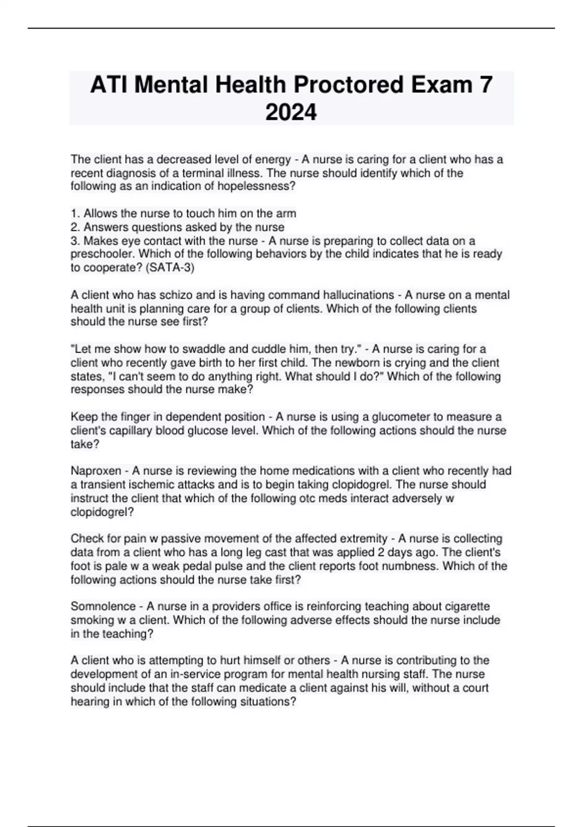 The client has a decreased level of energy - A nurse is caring for a client who has a recent diagnosis of a terminal illness. The nurse should identify which of the following as an indication of hopelessness? 1. Allows the nurse to touch him on the arm 2. Answers questions asked by the nurse 3. Makes eye contact with the nurse - A nurse is preparing to collect data on a preschooler. Which of the following behaviors by the child indicates that he is ready to cooperate? (SATA-3) A client who has schizo and is having command hallucinations - A nurse on a mental health unit is planning care for a group of clients. Which of the following clients should the nurse see first? "Let me show how to swaddle and cuddle him, then try." - A nurse is caring for a client who recently gave birth to her first child. The newborn is crying and the client states, "I can't seem to do anything right. What should I do?" Which of the following responses should the nurse make? Keep the finger in dependent position - A nurse is using a glucometer to measure a client's capillary blood glucose level. Which of the following actions should the nurse take? Naproxen - A nurse is reviewing the home medications with a client who recently had a transient ischemic attacks and is to begin taking clopidogrel. The nurse should instruct the client that which of the following otc meds interact adversely w clopidogrel? Check for pain w passive movement of the affected extremity - A nurse is collecting data from a client who has a long leg cast that was applied 2 days ago. The client's foot is pale w a weak pedal pulse and the client reports foot numbness. Which of the following actions should the nurse take first? Somnolence - A nurse in a providers office is reinforcing teaching about cigarette smoking w a client. Which of the following adverse effects should the nurse include in the teaching? A client who is attempting to hurt himself or others - A nurse is c