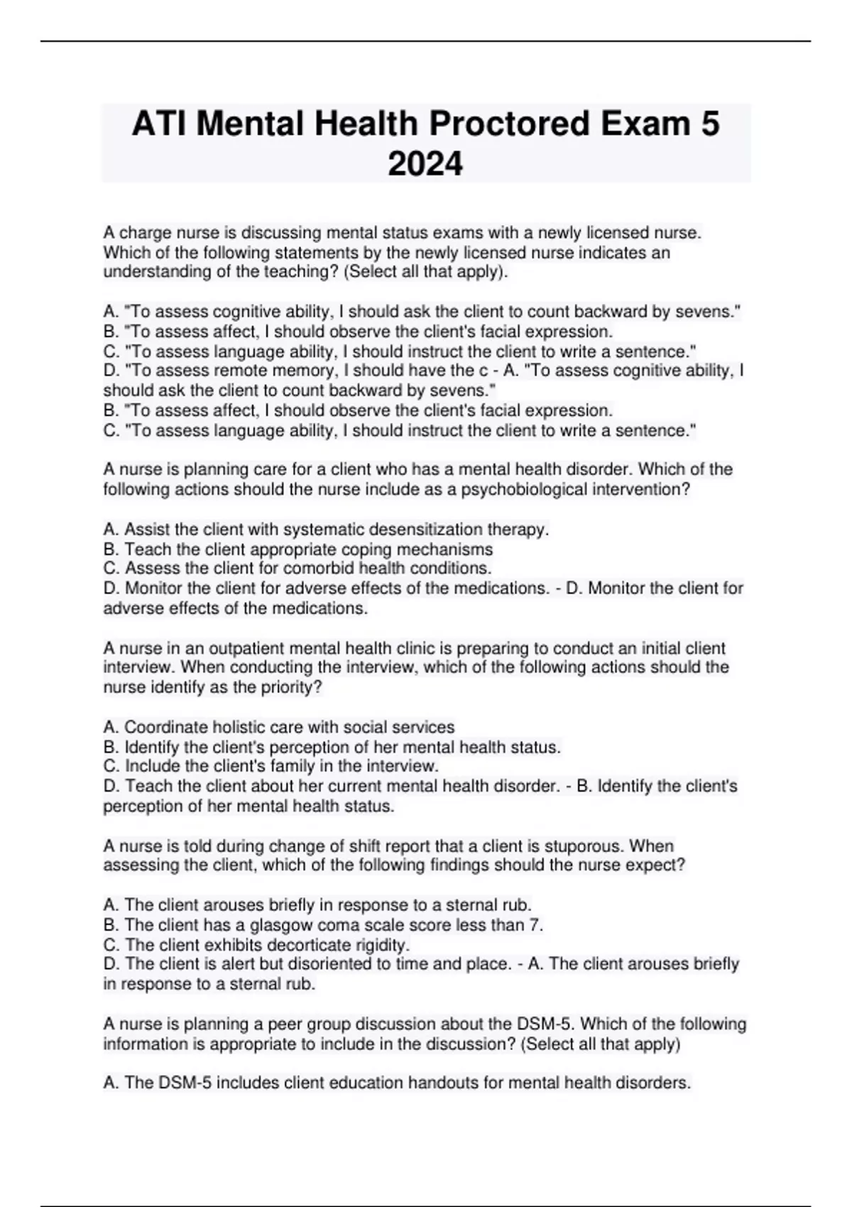 A charge nurse is discussing mental status exams with a newly licensed nurse. Which of the following statements by the newly licensed nurse indicates an understanding of the teaching? (Select all that apply). A. "To assess cognitive ability, I should ask the client to count backward by sevens." B. "To assess affect, I should observe the client's facial expression. C. "To assess language ability, I should instruct the client to write a sentence." D. "To assess remote memory, I should have the c - A. "To assess cognitive ability, I should ask the client to count backward by sevens." B. "To assess affect, I should observe the client's facial expression. C. "To assess language ability, I should instruct the client to write a sentence." A nurse is planning care for a client who has a mental health disorder. Which of the following actions should the nurse include as a psychobiological intervention? A. Assist the client with systematic desensitization therapy. B. Teach the client appropriate coping mechanisms C. Assess the client for comorbid health conditions. D. Monitor the client for adverse effects of the medications. - D. Monitor the client for adverse effects of the medications. A nurse in an outpatient mental health clinic is preparing to conduct an initial client interview. When conducting the interview, which of the following actions should the nurse identify as the priority? A. Coordinate holistic care with social services B. Identify the client's perception of her mental health status. C. Include the client's family in the interview. D. Teach the client about her current mental health disorder. - B. Identify the client's perception of her mental health status. A nurse is told during change of shift report that a client i