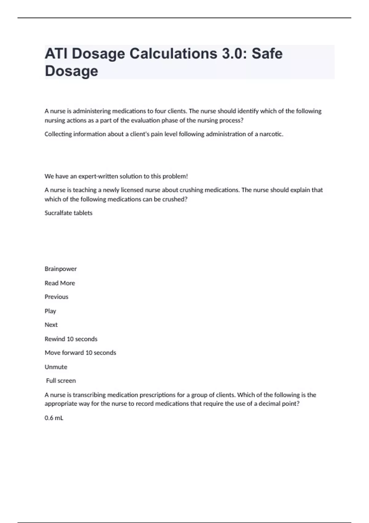 ATI Dosage Calculations 3.0: Safe DosageA nurse is administering medications to four clients. The nurse should identify which of the following nursing actions as a part of the evaluation phase of the nursing process? Collecting information about a client's pain level following administration of a narcotic. We have an expert-written solution to this problem! A nurse is teaching a newly licensed nurse about crushing medications. The nurse should explain that which of the following medications can be crushed? Sucralfate tablets Brainpower Read More Previous Play Next Rewind 10 seconds Move forward 10 seconds Unmute Full screen A nurse is transcribing medication prescriptions for a group of clients. Which of the following is the appropriate way for the nurse to record medications that require the use of a decimal point? 0.6 mL