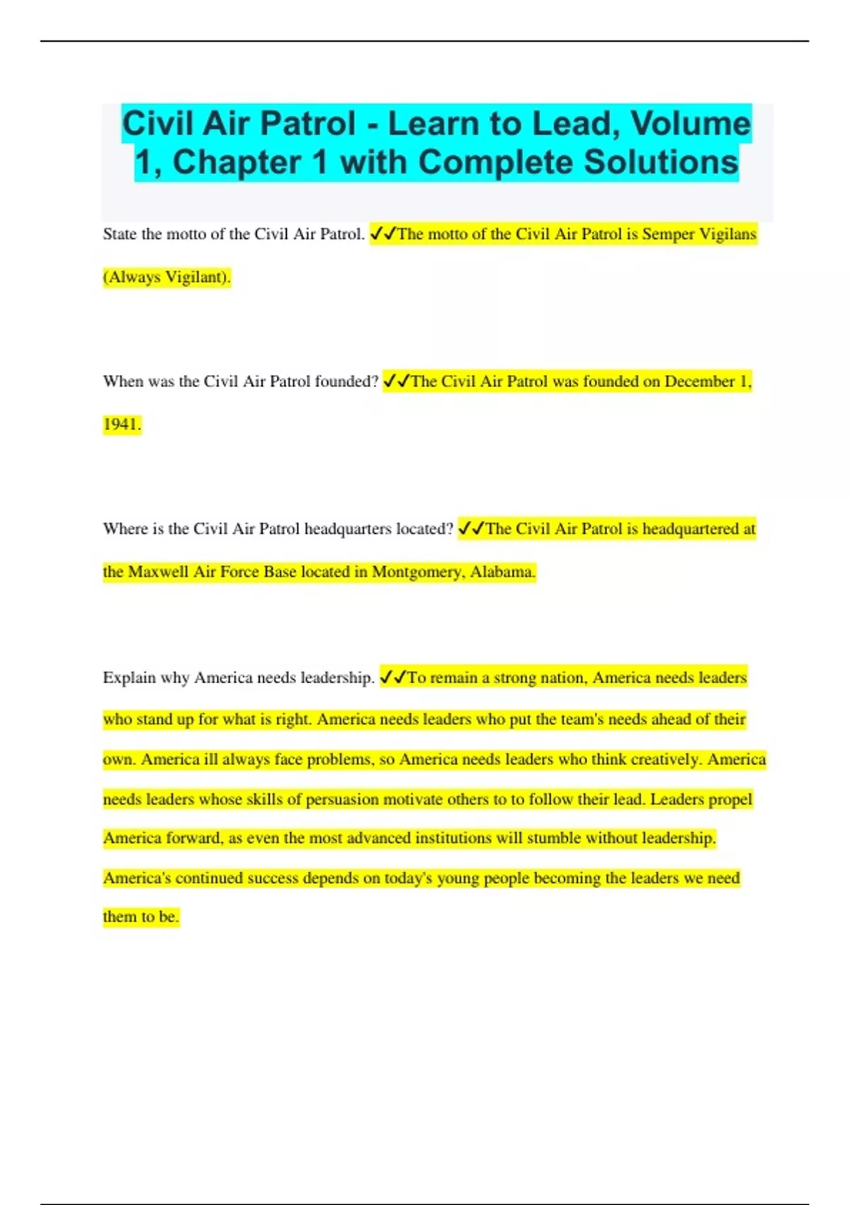 Civil Air Patrol - Learn to Lead, Volume 1, Chapter 1 with Complete Solutions State the motto of the Civil Air Patrol. The motto of the Civil Air Patrol is Semper Vigilans (Always Vigilant). When was the Civil Air Patrol founded? The Civil Air Patrol was founded on December 1, 1941. Where is the Civil Air Patrol headquarters located? The Civil Air Patrol is headquartered at the Maxwell Air Force Base located in Montgomery, Alabama. Explain why America needs leadership. To remain a strong nation, America needs leaders who stand up for what is right. America needs leaders who put the team's needs ahead of their own. America ill always face problems, so America needs leaders who think creatively. America needs leaders whose skills of persuasion motivate others to to follow their lead. Leaders propel America forward, as even the most advanced institutions will stumble without leadership. America's continued success depends on today's young people becoming the leaders we need them to be. Explain the source of leadership. A person's leadership ability comes from two sources: their natural talent, and their leadership education, training, and experience. Explain why leaders are rare. Maybe it's because leadership requires hard work or because leadership requires an uncommon willingness to put the team's needs ahead of one's own. Explain the first step in leadership. The first step in leadership is learning how to lead yourself. This includes learning how to contribute to a team, how to wear the uniform, how to drill, and how to follow the guidance of the leaders above you. What does the study of the art of leadership begin with? The study of the art of leadership should begin with its most important element, character. Explain what a "warrior" is in the context of the "warrior spirit". A warrior is someone whose strong character enables them to make sacrifices for the team and achieve their long-term goals. Warriors defend their personal honor. The Air Force defines the warrior spirit as a condition of the heart: a tough-mindedness and tireless motivation. Describe the hallmarks of the warrior spirit. Having a warrior spirit means that you make a promise to yourself that you will not lie, cheat, or steal, even if everyone else commits these wrongs. Identify three benefits of having a warrior spirit. Clear conscience, good reputation, and an environment of trust and respect. Describe what core values are. Core values are the four basic qualities that the Civil Air Patrol expects all members to display at all times. They are like road signs giving us basic directions on our journey. Identify and describe each of CAP's four core values. Integrity is the willingness to do what is right, even when no one is looking. Volunteer service teaches us that the needs of the team and of the people we help take priority over