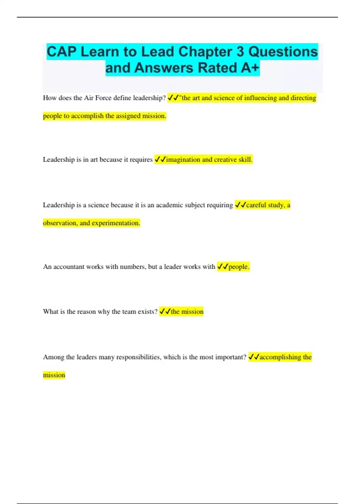 CAP Learn to Lead Chapter 3 Questions and Answers Rated A+ How does the Air Force define leadership? "the art and science of influencing and directing people to accomplish the assigned mission. Leadership is in art because it requires imagination and creative skill. Leadership is a science because it is an academic subject requiring careful study, a observation, and experimentation. An accountant works with numbers, but a leader works with people. What is the reason why the team exists? the mission Among the leaders many responsibilities, which is the most important? accomplishing the mission Most experts include in their definition of "leadership" three components: the leader, the follower(s), and the goal. How we approach leadership is based on culture. This involves these three factors: attitudes, customs, and the use of a civilization-influences In America, our society is built on these values democratic values. Recall the Air Force's definition of leadership: no reference is made to a leader having a certain rank or position. Leading is now seen as something everyone has the potential for. Complete this statement. Absolute power __________ __________ corrupts absolutely. These three strategies are not tools genuine leaders use. Threats, coercion, and extortion James Macgregor Burns position is "Bad leadership implies no leadership. I contend that there is nothing neutral about leadership; it is valued as a moral necessity." In the everyday sense of the word, "to lead" means to bring someone to a new place. Visionary leaders paint this for the whole team. an inspiring future picture Seventeen years before Pearl Harbor, Billy Mitchell was warning that Japan could use carrier-based airplanes to attack Hawaii. Billy Mitchell's vision called for creating an independent Air Force that would not be subject to the Army or Navy Cadets want to have a sense of ownership over their programs. With that freedom comes the responsibility to . provide visionary leadership Living in the real world, leaders must envision the future A skillful leader understands how to issue