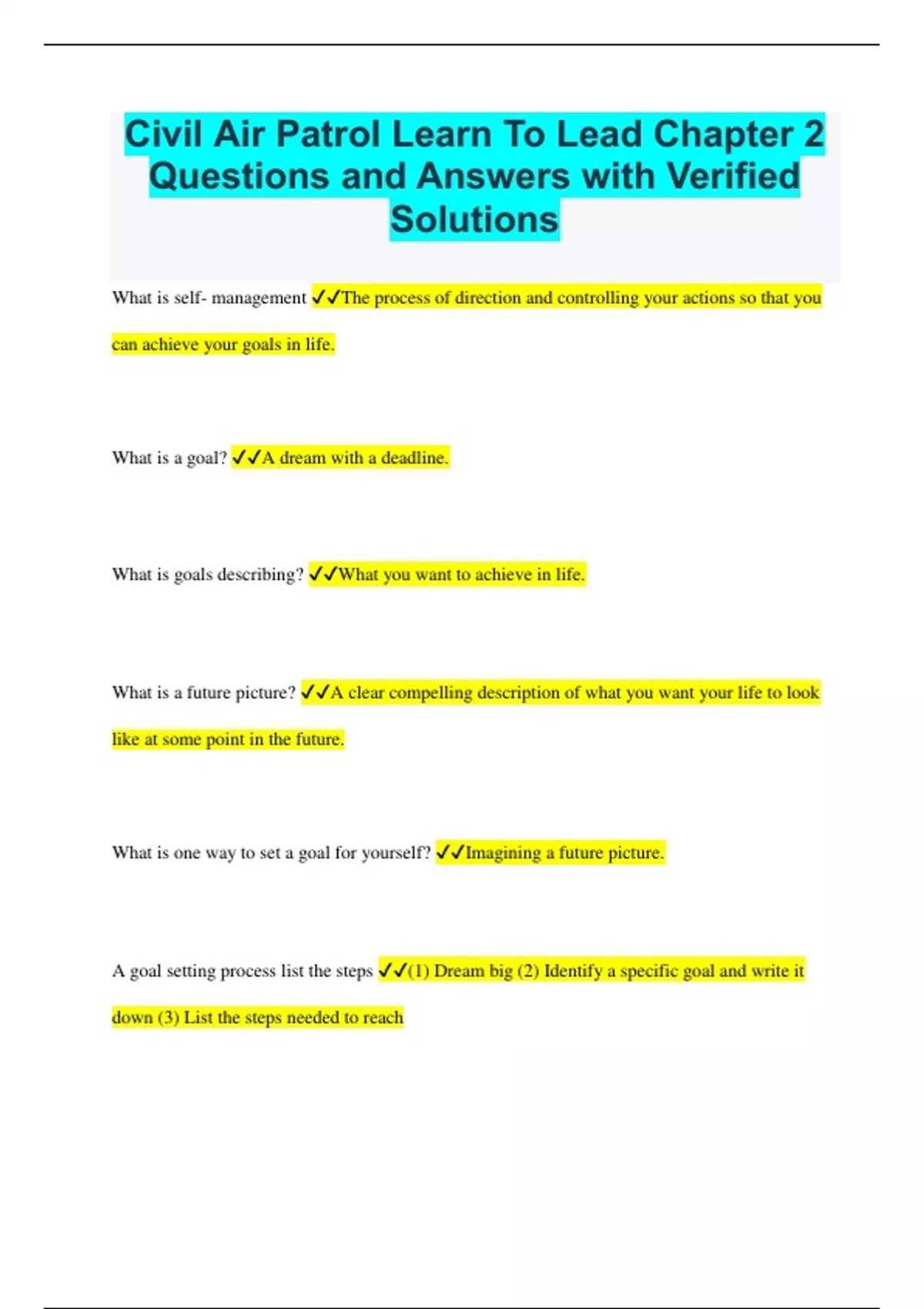 Civil Air Patrol Learn To Lead Chapter 2 Questions and Answers with Verified Solutions What is self- management The process of direction and controlling your actions so that you can achieve your goals in life. What is a goal? A dream with a deadline. What is goals describing? What you want to achieve in life. What is a future picture? A clear compelling description of what you want your life to look like at some point in the future. What is one way to set a goal for yourself? Imagining a future picture. A goal setting process list the steps (1) Dream big (2) Identify a specific goal and write it down (3) List the steps needed to reach the goal (4) get help and support from others (5) work towards your goal one step at a time (6) Reward yourself along the way and when you complete your goal What is the benefit of goal setting? Goals give you a sense of mission a rudder a meaningful purpose What do good leaders follow? A decision making process List the steps for decision making process. (1) Stop think and define the problem (2) get the facts (3) brainstorm and list your options (4) Weigh your options (5) consider your values (6) decide and act (7) re-evaluate the decision. Define brainstorming. A method of generation a large number of creative ideas Define Stakeholders. People who have a stake in the solution Define ethical trap The solution to the problem turns out to be unethical as a result a secondary ethical problem pops up. Define time management The process of organizing and using your time wisely Define efficiency How well