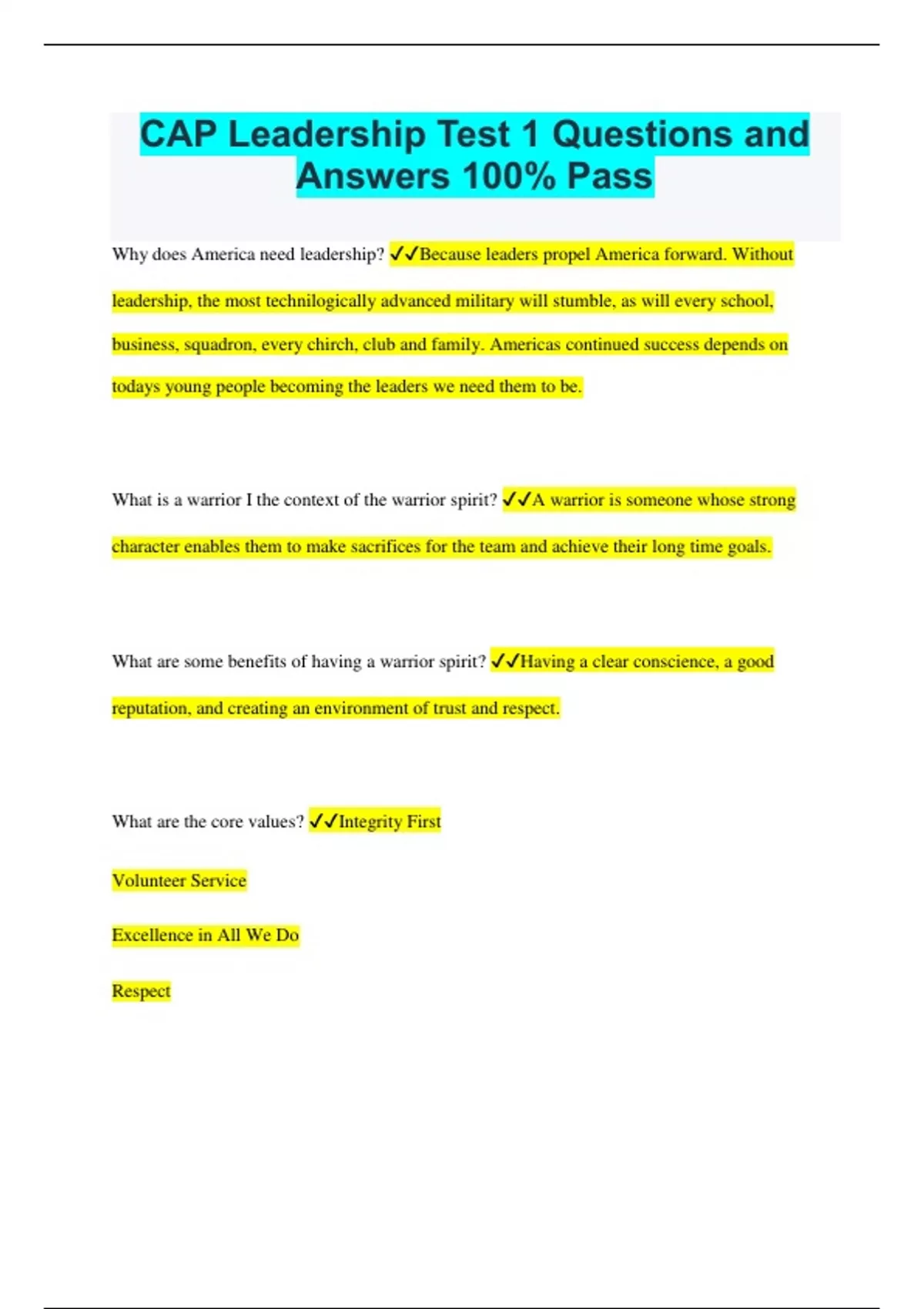 CAP Leadership Test 1 Questions and Answers 100% Pass Why does America need leadership? Because leaders propel America forward. Without leadership, the most technilogically advanced military will stumble, as will every school, business, squadron, every chirch, club and family. Americas continued success depends on todays young people becoming the leaders we need them to be. What is a warrior I the context of the warrior spirit? A warrior is someone whose strong character enables them to make sacrifices for the team and achieve their long time goals. What are some benefits of having a warrior spirit? Having a clear conscience, a good reputation, and creating an environment of trust and respect. What are the core values? Integrity First Volunteer Service Excellence in All We Do Respect What is the core value integrity first? Integrity is the willingness to do what is right, even when no one is looking. What is the core value volunteer service? Volunteer service is all about selflessness. It's the difference between giving and taking. What is the core value excellence in all we do? No matter what challenge is facing you, always give your best effort. What is the core value respect Someone who is respectful treats others as they would like to be treated. What is self-awareness? The ability to monitor and judge your own actions? What is self-discipline? The ability to detect your thoughts, emotions and actions toward a meaningful purpose. What is attitude? The state of mind that lies behind your every action. What is an oath? A solemn promise What do the root of all military customs and courtesies? Basic politeness and respect. What are the basic rules for rendering common military customs and courtesies? The salute Coming to attention Position of honor Introducing people What usefulness does the uniform have as a leadership training tool? A vehicle of self- discipline, personal responsibility, and self-respect. Why is image important while wearing a uniform? One persons conduct reflects on everyone else in the group? Why is wearing the uniform a privilege? There