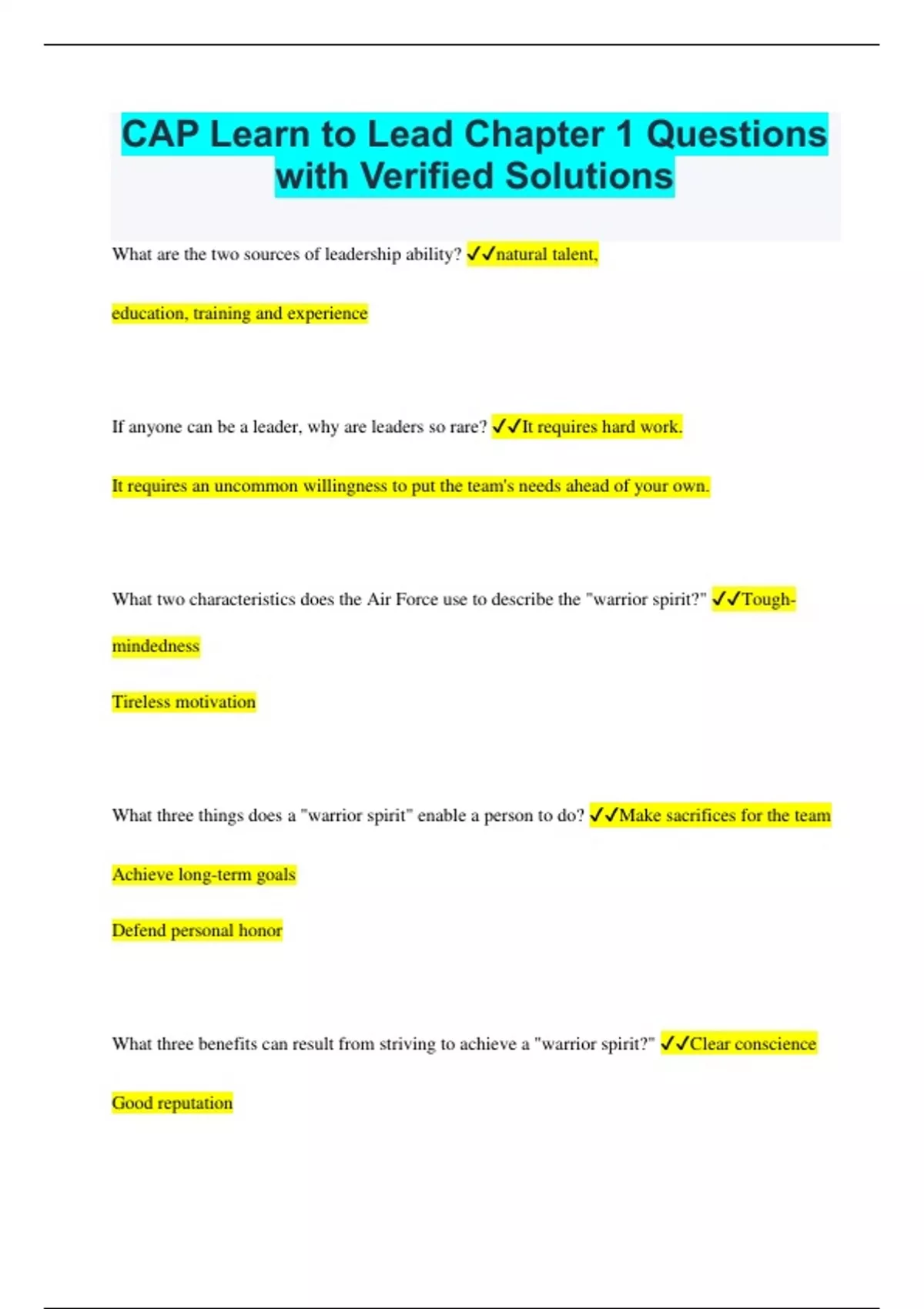 CAP Learn to Lead Chapter 1 Questions with Verified Solutions What are the two sources of leadership ability? natural talent, education, training and experience If anyone can be a leader, why are leaders so rare? It requires hard work. It requires an uncommon willingness to put the team's needs ahead of your own. What two characteristics does the Air Force use to describe the "warrior spirit?" Tough- mindedness Tireless motivation What three things does a "warrior spirit" enable a person to do? Make sacrifices for the team Achieve long-term goals Defend personal honor What three benefits can result from striving to achieve a "warrior spirit?" Clear conscience Good reputation Being in an environment of trust and respect a person who is attempting to foster trust and respect in team members is striving to achieve a "warrior spirit" What are the four core values that all Civil Air Patrol members are expected to uphold? Integrity first Volunteer service Excellence in all we do Respect What should all men and women of goodwill agree upon concerning Civil Air Patrol core values and personal religious beliefs? They are important moral guideposts. A person who is honest and morally courageous person has integrity The person who fulfills his responsibilities even in difficult circumstances has what personal quality? integrity Someone who doesn't blame others for their mistakes has what personal quality? integrity A person who doesn't take credit for others work has what personal quality? integrity The core value of Volunteer Service teaches us that the needs of the team take precedence over what? Individual wants and desires The core value of Respect challenges you to assume that friends and strangers are acting in good faith. The core value of Respect challenges you to understand that each individual is unique In what manner does respect challenge you to "accept others for who they are?" A spirit of tolerance When you make a commitment to continuous self-improvement you're living which core value? Excellence