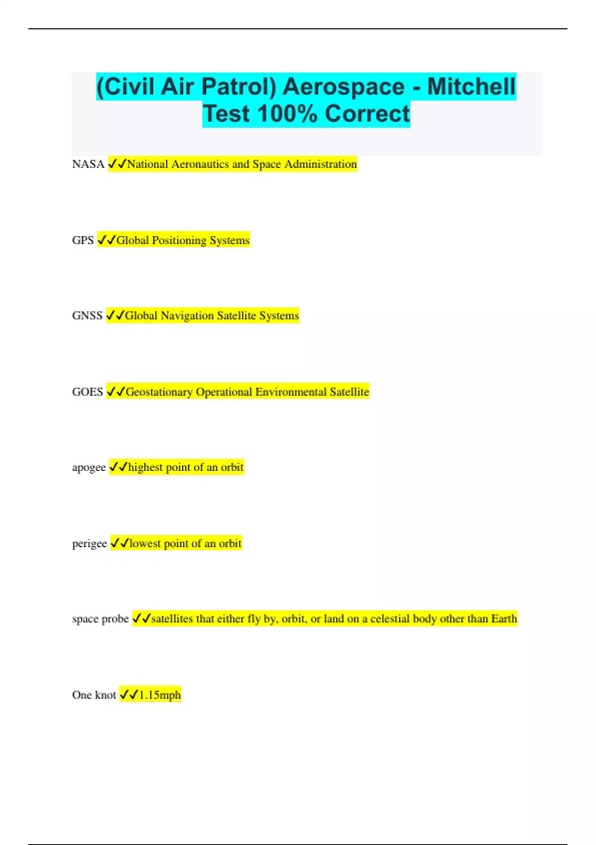 (Civil Air Patrol) Aerospace - Mitchell Test 100% Correct NASA National Aeronautics and Space Administration GPS Global Positioning Systems GNSS Global Navigation Satellite Systems GOES Geostationary Operational Environmental Satellite apogee highest point of an orbit perigee lowest point of an orbit space probe satellites that either fly by, orbit, or land on a celestial body other than Earth One knot 1.15mph Instruments in a hot air balloon altimeter thermistor variometer interstellar space region from space from one solar system to another Yuri Gagarin First man to orbit Earth and in space One mile Saturn's rings (width) Explorer First and oldest US space shuttle William Congreve Increased range from 200 - 3,000 miles Light year the distance light travels in one Earth year Hermann Oberth wrote books on traveling to outer space Explorer 1 recognized the Van