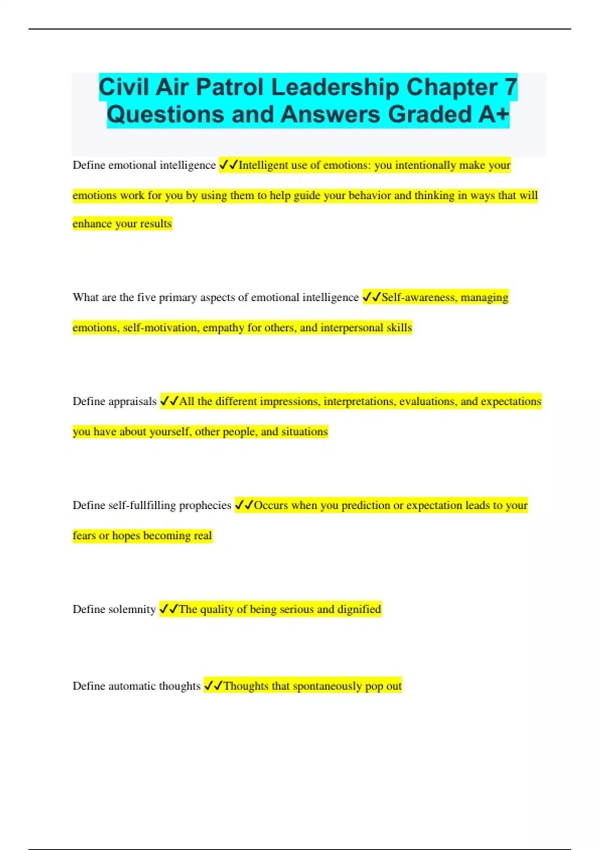 Civil Air Patrol Leadership Chapter 7 Questions and Answers Graded A+ Define emotional intelligence Intelligent use of emotions: you intentionally make your emotions work for you by using them to help guide your behavior and thinking in ways that will enhance your results What are the five primary aspects of emotional intelligence Self-awareness, managing emotions, self-motivation, empathy for others, and interpersonal skills Define appraisals All the different impressions, interpretations, evaluations, and expectations you have about yourself, other people, and situations Define self-fullfilling prophecies Occurs when you prediction or expectation leads to your fears or hopes becoming real Define solemnity The quality of being serious and dignified Define automatic thoughts Thoughts that spontaneously pop out What are self-statements Motivational expressions of belief in oneself What is mental imagery A mental picture Define empathy Understanding, being aware of, and being sensitive to the feelings, thoughts, and experiences of another Describe what interpersonal skills are Involves developing and maintaining positive relationships with others Define transformational leadership When a person strives to heighten the motivation and moral of himself and his followers Define transactional leadership An exchange that takes place between the leader and the follower What is idealized influence Refers to the leader's principles and standards having the power to attract followers Define inspirational motivation Leaders who communicate high expectations to followers, inspiring them to become committed to and a part of the shared vision in an organization Define individualized consideration Describes leaders who are supportive of followers, listen closely to them, and acknowledge their unique needs Define contingent reward Describes an interaction between the leader and the follower in which the follower's effort is exchanged for rewards What does MBE stand for Management by expectation What does laissez-faire mean A French word that refers to a hands off or let things ride approach Define power The ability of one person to influence another What are the five types of power Legitimate, reward, coercive, expert, and referent power Define learning organization Places where people are continually learning together Define system A regularly interacting or