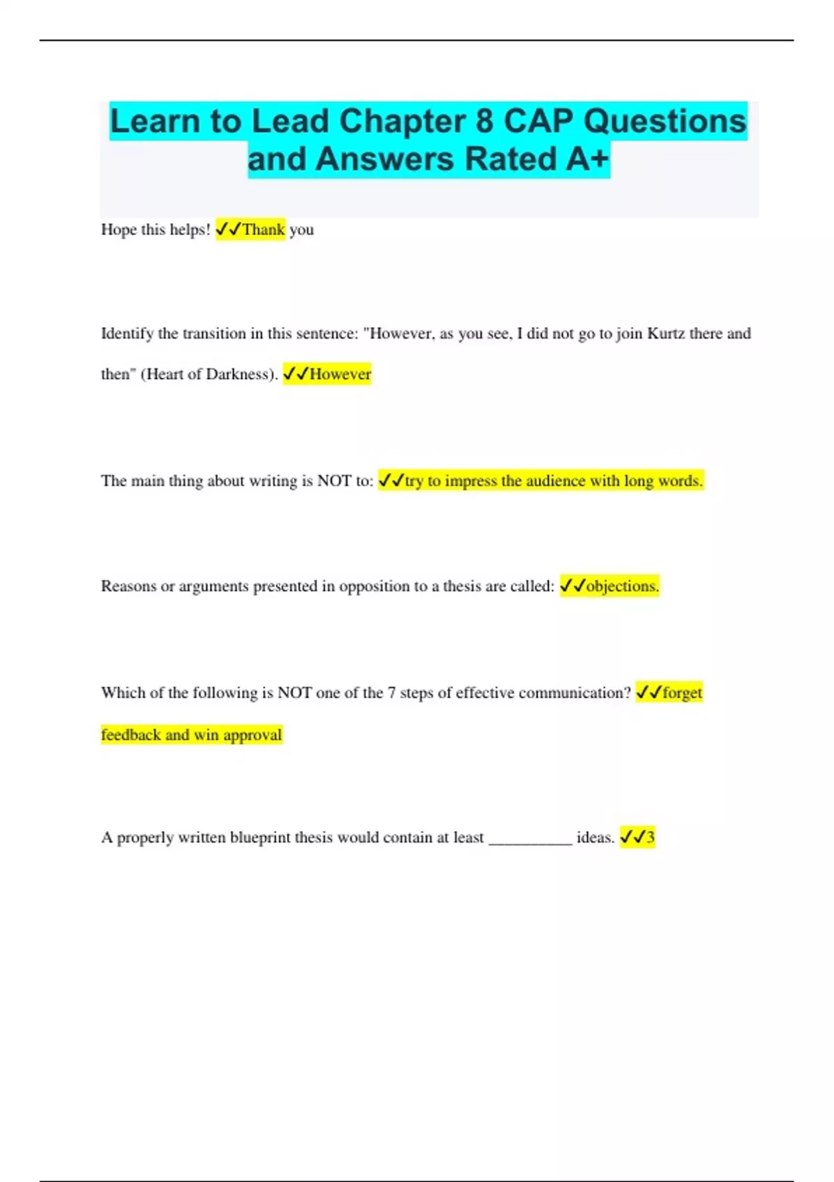 Learn to Lead Chapter 8 CAP Questions and Answers Rated A+ Hope this helps! Thank you Identify the transition in this sentence: "However, as you see, I did not go to join Kurtz there and then" (Heart of Darkness). However The main thing about writing is NOT to: try to impress the audience with long words. Reasons or arguments presented in opposition to a thesis are called: objections. Which of the following is NOT one of the 7 steps of effective communication? forget feedback and win approval A properly written blueprint thesis would contain at least __________ ideas. 3 Identify the transition words in these sentences: In the meantime, more ships were being sunk, and the Army and Navy still lacked strength to offer much more than token protection (Flying Minute Men, 10). In the meantime Which CAP Core Value can a writer demonstrate by anticipating objections to an argument? respect An anxiety of speaking in front of people is called: stage fright. One carefully plans and outlines this type of speech but does not read it word-for-word. extemporaneous In the 6-step problem-solving method, which step is completed right after gathering data? list possible solutions Which grammar error does this sentence suffer from? "The encampment food was so terrible all the cadets were hungry they ate all the MREs." run-on sentence Changing "Cadet Curry was awarded a flight scholarship" to an active voice would create the sentence. "Cadet Curry won a flight scholarship." The major parts of a resume include your contact data and objective, along with: education, experience, honors and references. Technical words having a specific meaning within a certain field are known as jargon. Unnecessary words in a sentence are called _________. clutter. Transitions function __________ paragraphs. between. A misconception for those new to writing and speaking is that creating an outline is: difficult The primary goal of writing (or speaking)