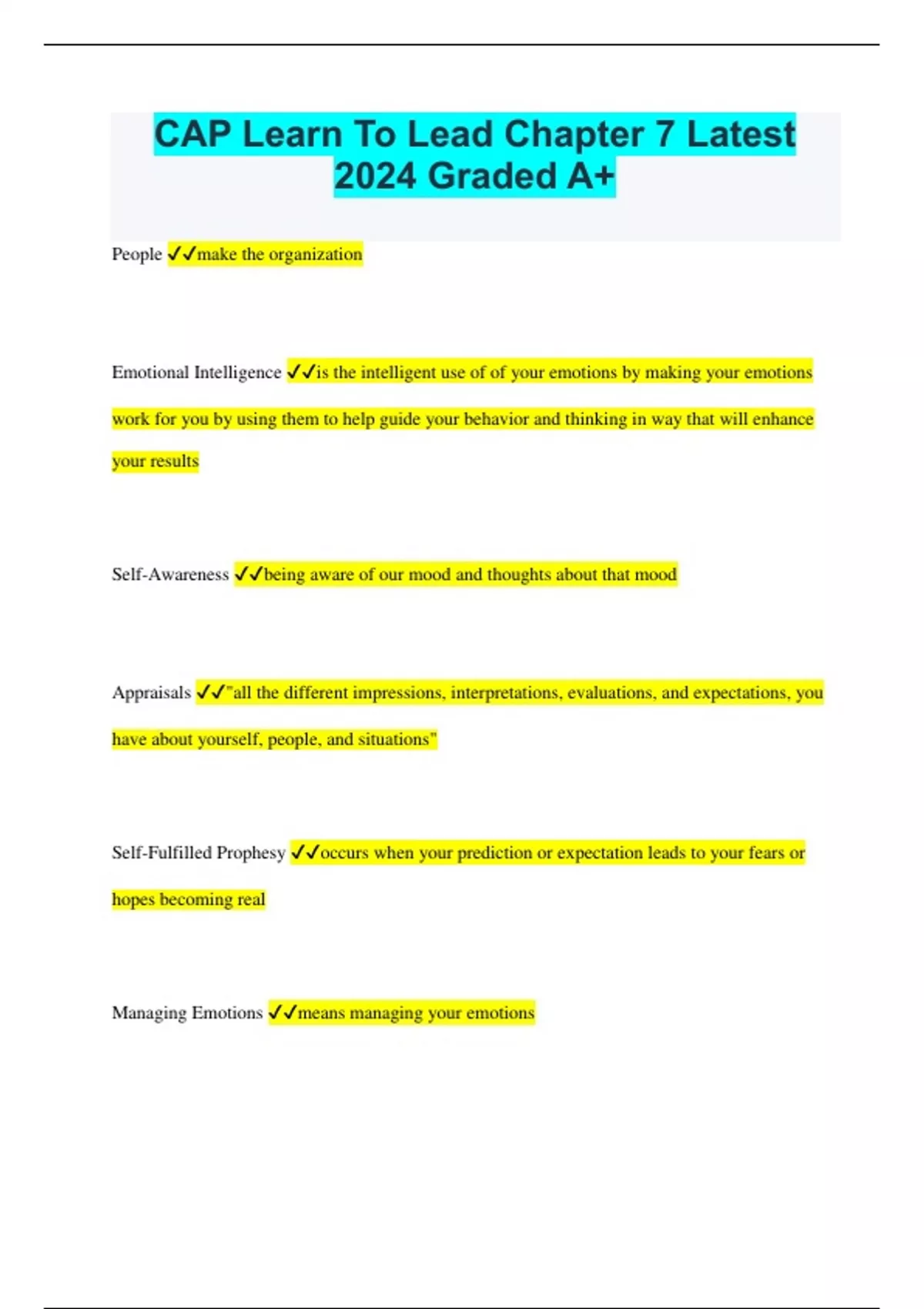CAP Learn To Lead Chapter 7 Latest 2024 Graded A+ People make the organization Emotional Intelligence is the intelligent use of of your emotions by making your emotions work for you by using them to help guide your behavior and thinking in way that will enhance your results Self-Awareness being aware of our mood and thoughts about that mood Appraisals "all the different impressions, interpretations, evaluations, and expectations, you have about yourself, people, and situations" Self-Fulfilled Prophesy occurs when your prediction or expectation leads to your fears or hopes becoming real Managing Emotions means managing your emotions Solemnity the quality of being serious and dignified Inner Dialogue talking to yourself Automatic Thoughts "thoughts that spontaneously pop put" Motivational Self-Statements are simple expressions of belief in oneself Mental Imagery picturing yourself in a situation Flow is the feeling people enjoy when they are so absorbed in a task that they forget about all of their worries Empathy is understanding, being aware of, and being sensitive to the feelings, thoughts, and experiences of another Interpersonal Skill involves developing and maintaining positive relationships with others Transformational Leadership in which a person strives to heighten the motivation and morality of himself and his followers Transactional Leadership in which an exchange takes place between a leader and follower Idealized Influenced refers to a the leader's principles and standards having the power to attract followers Inspirational Motivation describes leaders who "communicate high expectations to followers, inspiring them to become committed to and a part of the shared vision in an organization" "Yes" Man a follower who is overly-eager to please his or her leader without truly thinking things through. always reply yes to every question, statement, or request of the leader, even if the follower knows the leader is wrong Individualized Consideration describes leaders who are supportive of followers, listen closely to them, an acknowledge their unique needs Contingent occurring only when certain conditions are met