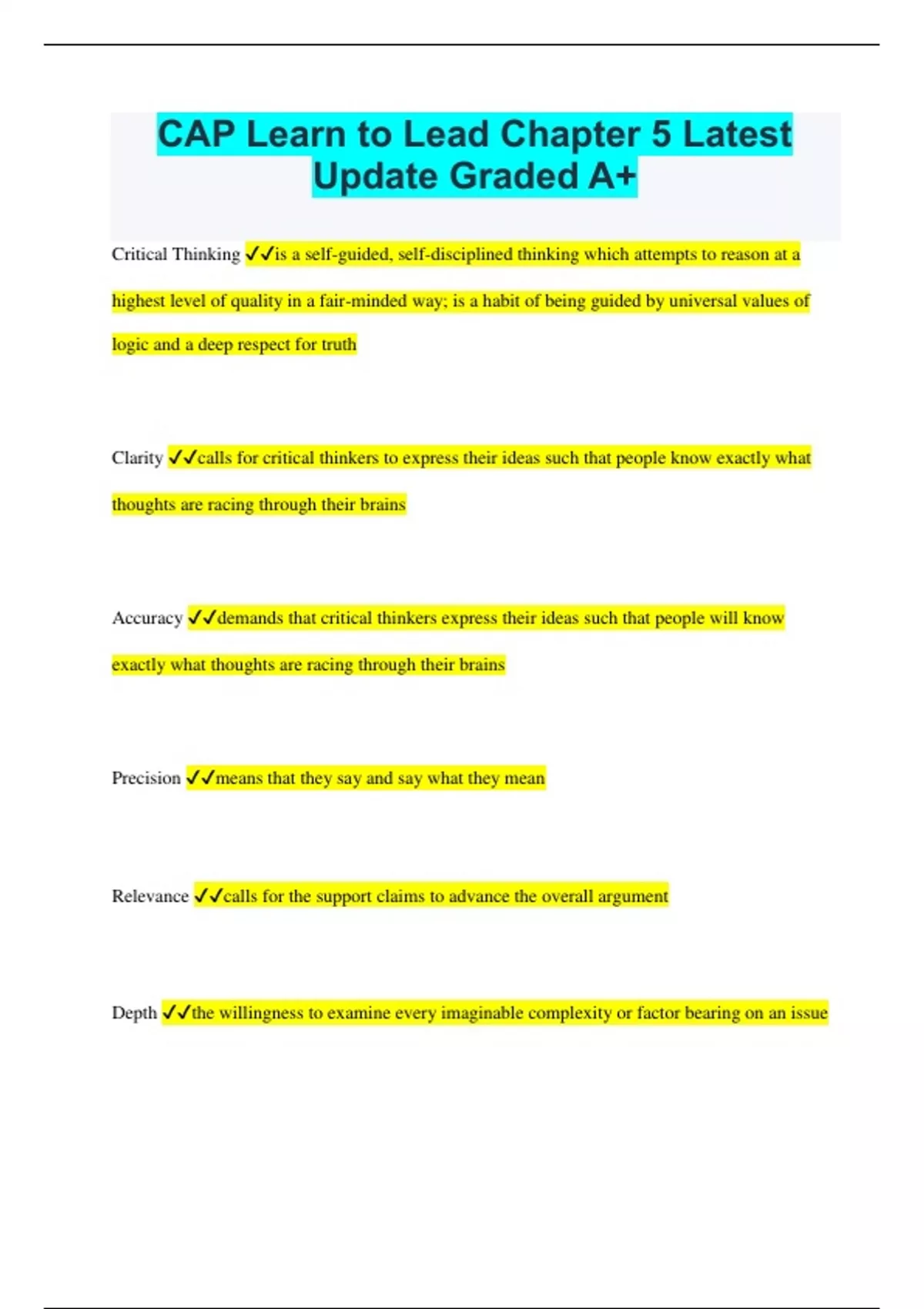 CAP Learn to Lead Chapter 5 Latest Update Graded A+ Critical Thinking is a self-guided, self-disciplined thinking which attempts to reason at a highest level of quality in a fair-minded way; is a habit of being guided by universal values of logic and a deep respect for truth Clarity calls for critical thinkers to express their ideas such that people know exactly what thoughts are racing through their brains Accuracy demands that critical thinkers express their ideas such that people will know exactly what thoughts are racing through their brains Precision means that they say and say what they mean Relevance calls for the support claims to advance the overall argument Depth the willingness to examine every imaginable complexity or factor bearing on an issue Breadth concerns how far across either side he or she is willing to look when considering an issue Logic what an argument is called when one point supports the next and the conclusions flow natural Big Picture Thinking is the practice of stepping back from an issue or problem so as to make more of it in Focused Thinking is the practice of intensely studying an issue, trying to see it clearly, and not becoming distracted by other issues that are somewhat related to, but different from, the specific question at hand Realistic Thinking is an approach where the leader tries to see the world for how it actually is, not what we may wish it to be Shared Thinking involves valuing the thoughts and ideas of others Synergy the belief that the team is greater than the sum of its parts Emotional Insecurity the biggest obstacle to shared thinking Logical Fallacy is an error of reasoning Fallacy a mistake in logic; bad reasoning that corrupts a line of thoughts Intellectual Honesty honesty in the acquisition,