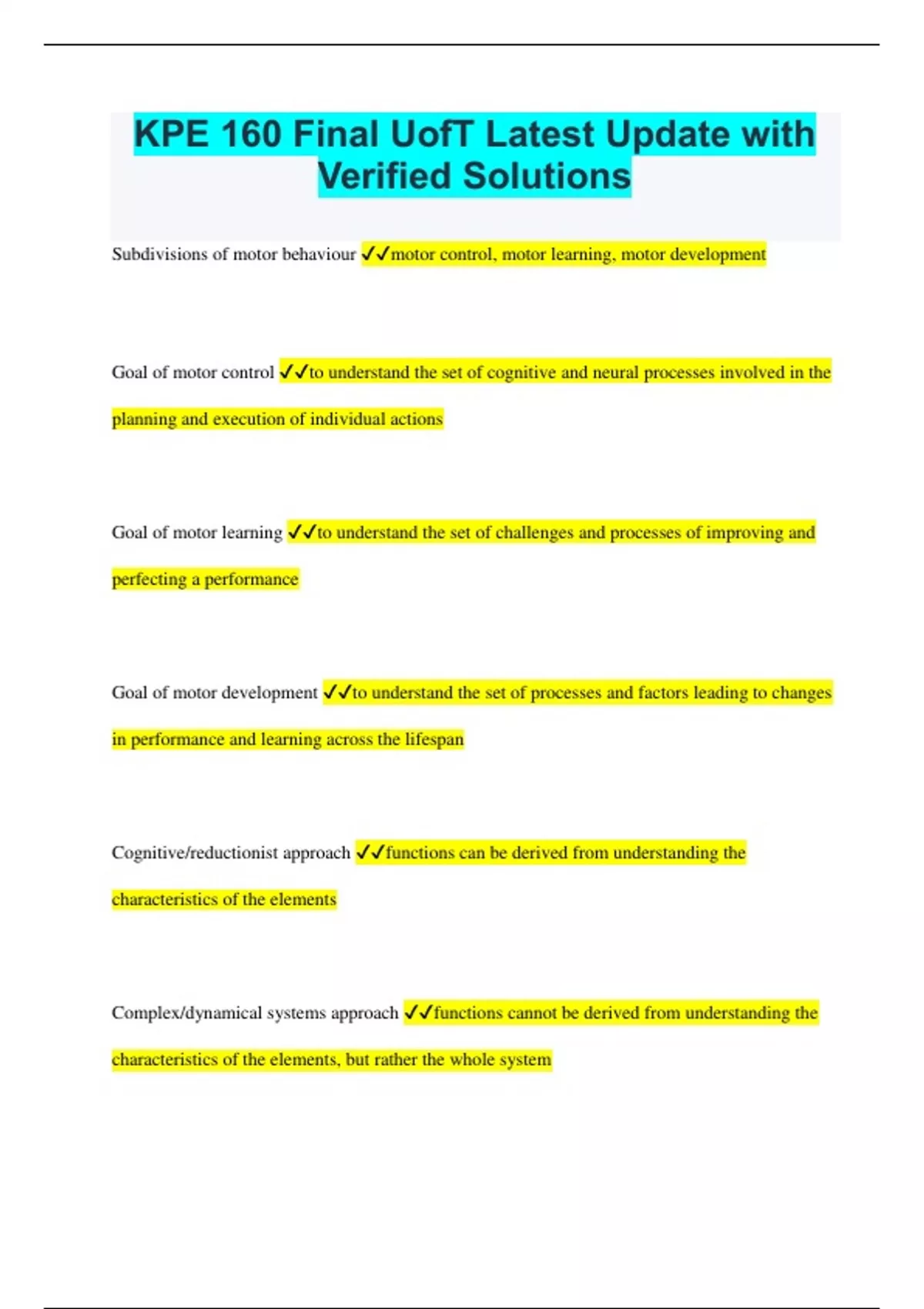 KPE 160 Final UofT Latest Update with Verified Solutions Subdivisions of motor behaviour motor control, motor learning, motor development Goal of motor control to understand the set of cognitive and neural processes involved in the planning and execution of individual actions Goal of motor learning to understand the set of challenges and processes of improving and perfecting a performance Goal of motor development to understand the set of processes and factors leading to changes in performance and learning across the lifespan Cognitive/reductionist approach functions can be derived from understanding the characteristics of the elements Complex/dynamical systems approach functions cannot be derived from understanding the characteristics of the elements, but rather the whole system Focus of information processing approach of reductionism the focus is on the manner in which stimulus information is used to bring about behaviour Neuroscience approach of reductionism the focus is on the neural events underlying movement Active/endogenous movement movement resulting from muscular contractions Passive/exogenous movement movement resulting from forces that are external to the body Reflex action (motor responses) involuntary and relatively stereotyped responses to specific stimuli — the result of a specific, unchanging neural network Characteristics of reflex action short latency, generalized/stereotyped, conscious awareness does not precede response involuntarily, response is generally determined by stimulus, innate Voluntary action (motor responses) a response resulting from higher order processing — the result of a flexible and variable neural network Characteristics of voluntary action longer latency, adaptable/can be novel, conscious awareness precedes response, voluntary, responses are related to but not determined by stimuli, learned Motor skills a behavior for which the primary determinant is the quality of the movement that the performer produces Task perspective of motor skills size of muscle groups, task organization, importance of cognitive and motor involvement, predictability of environment Types of motor group classification gross, fine, mixed Types of task organization classification discrete, serial, continuous Types of cognitive/motor involvement classification cognitive, motor Types of environmental predictability classification