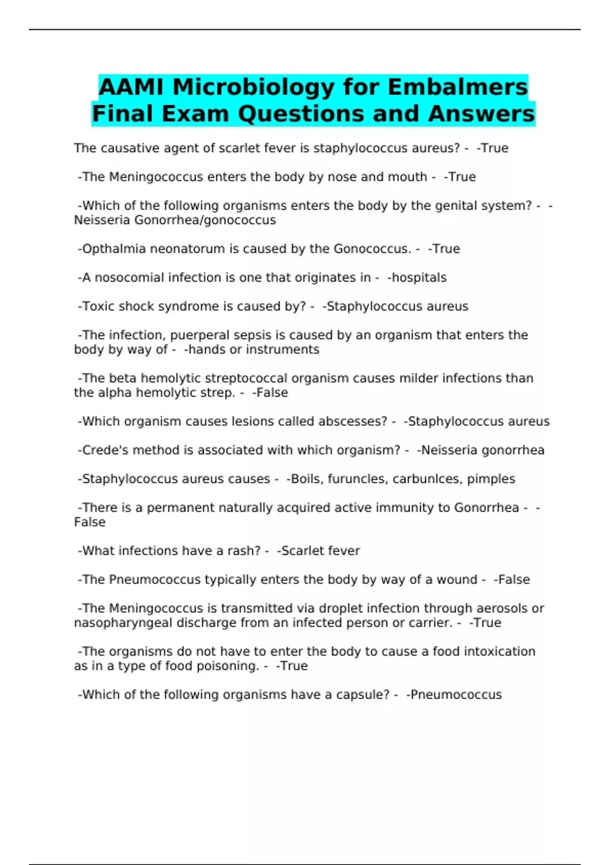 AAMI Microbiology for Embalmers Final Exam Questions and Answers