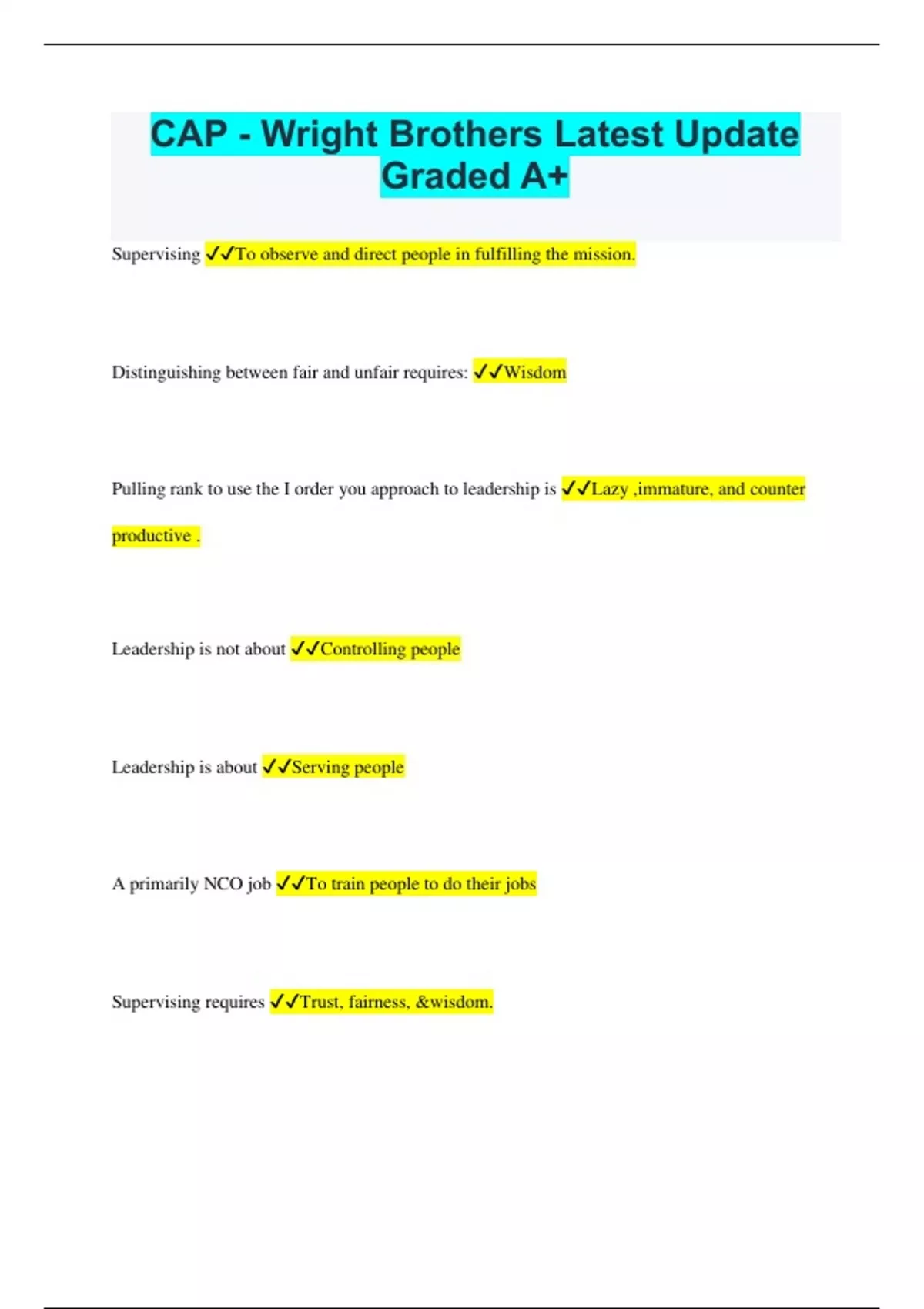 CAP - Wright Brothers Latest Update Graded A+ Supervising To observe and direct people in fulfilling the mission. Distinguishing between fair and unfair requires: Wisdom Pulling rank to use the I order you approach to leadership is Lazy ,immature, and counter productive . Leadership is not about Controlling people Leadership is about Serving people A primarily NCO job To train people to do their jobs Supervising requires Trust, fairness, &wisdom. Initiative The ability to make sound judgements & act independently Esprit De Corps A sense of team pride, fellowship,and loyalty Tactical leader First line supervisors who help people who directly accomplish the mission To keep constructive discipline positive, leaders focus on: Performance Motivation A strong reason or desire for something Constructive discipline is a learning process that provides an opportunity for Positive growth Physical readiness Being healthy and leading fitness training A fundamental law of leadership Praise on public, correct in private Coaching When someone struggles to reach a