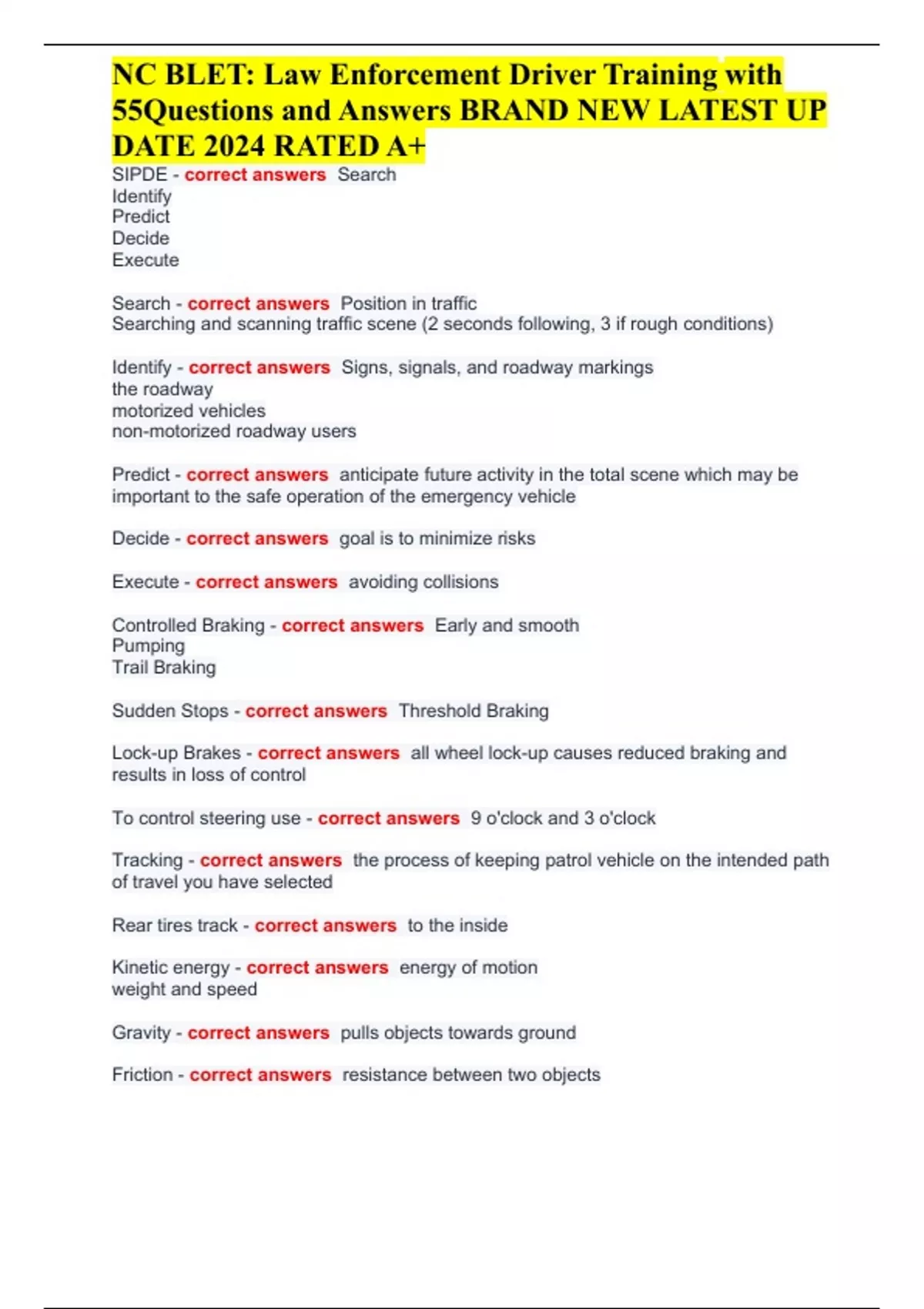 NC BLET: Law Enforcement Driver Training with 55Questions and Answers BRAND NEW LATEST UP DATE 2024 RATED A+