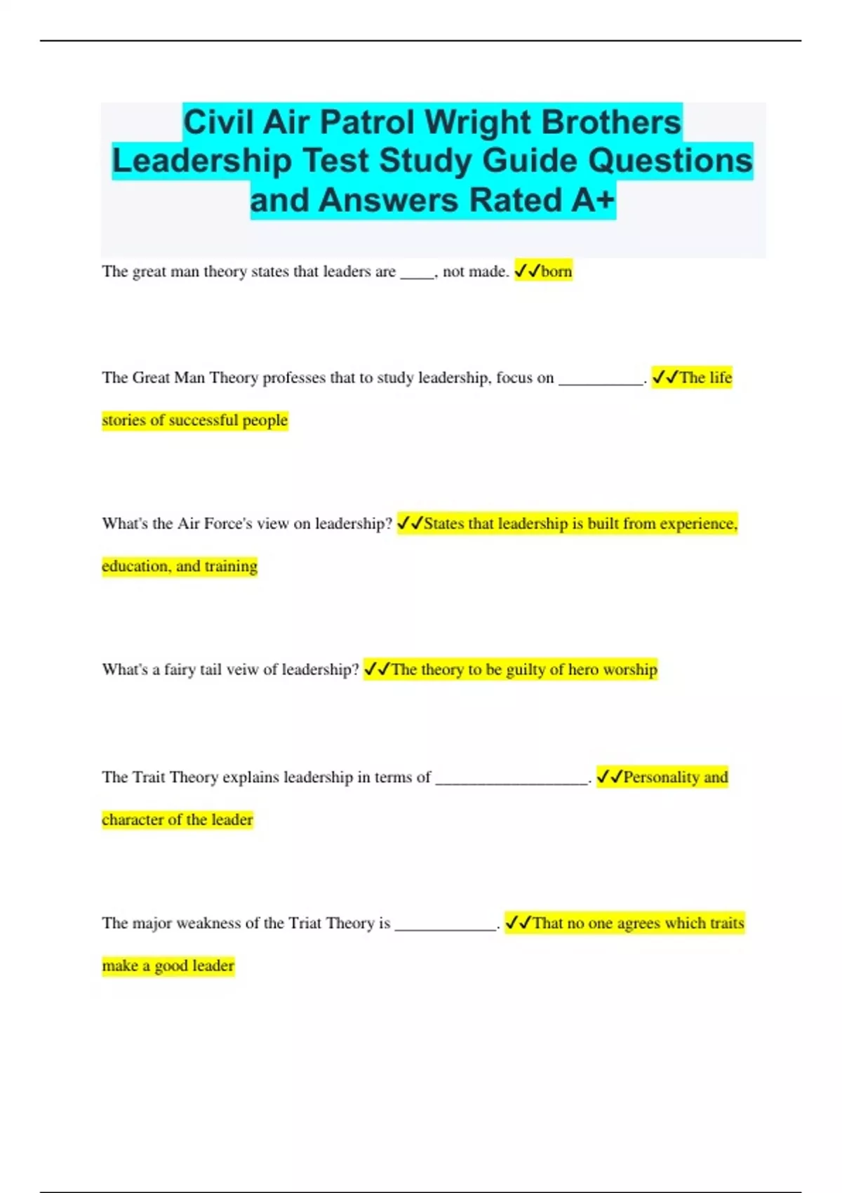 Civil Air Patrol Wright Brothers Leadership Test Study Guide Questions and Answers Rated A+