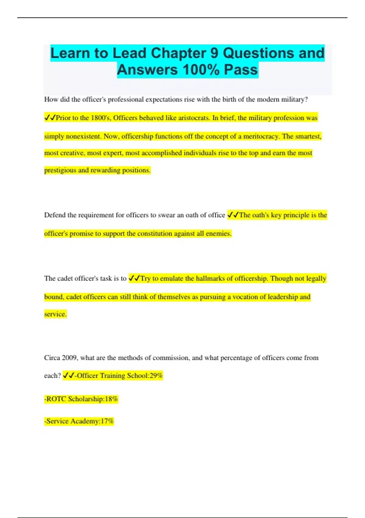 Learn to Lead Chapter 9 Questions and Answers 100% Pass How did the officer's professional expectations rise with the birth of the modern military? Prior to the 1800's, Officers behaved like aristocrats. In brief, the military profession was simply nonexistent. Now, officership functions off the concept of a meritocracy. The smartest, most creative, most expert, most accomplished individuals rise to the top and earn the most prestigious and rewarding positions. Defend the requirement for officers to swear an oath of office The oath's key principle is the officer's promise to support the constitution against all enemies. The cadet officer's task is to Try to emulate the hallmarks of officership. Though not legally bound, cadet officers can still think of themselves as pursuing a vocation of leadership and service. Circa 2009, what are the methods of commission, and what percentage of officers come from each? -Officer Training School:29% -ROTC Scholarship:18% -Service Academy:17% -ROTC Non-Scholarship:12% -Direct Appointment:17% Other/Unknown:7% Describe the four forms of indirect leadership 1.Leadership from a distance 2.Leadership through a link 3.Leadership through creation 4.Upward influence What does the term "link" mean in the context of indirect leadership? E.g. Flight commanders and element leaders are the "links" who relay messages to the lower levels. Why can upward influence be a positive form of indirect leadership? Upward influence will be seen only in organizations where bosses truly show they are willing to listen to subordinates, and when those subordinates are truly made to feel that their input is valued. Why are organizations and leaders expected to honor a public trust? Because power requires consent. The entire American civilization is built upon the belief that just powers come from the consent of the governed. Leaders who find themselves in powerful positions have an obligation to the public at large. Some sample issues relating to corporate social responsibility are -Corruption -Stewardship -Philanthropy -Sustainability -Human rights -Transparency What is a professional organization A group that seeks to further a certain profession, help members succeed in that profession, and uphold the public trust. Why do professionals often join professional associations? In their efforts to honor public trust, professionals join professional associations. Why do most professional associations adopt a code of ethics? Because it is a way for them to advance their profession and earn