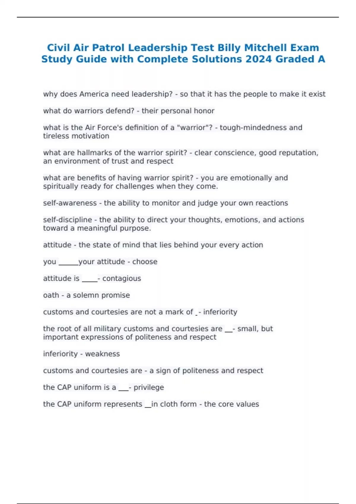 Civil Air Patrol Leadership Test Billy Mitchell Exam Study Guide with Complete Solutions 2024 Graded A
