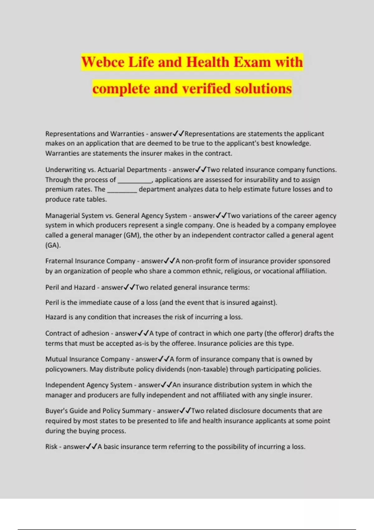 Webce Life and Health Exam with complete and verified solutions Representations and Warranties - answerRepresentations are statements the applicant makes on an application that are deemed to be true to the applicant's best knowledge. Warranties are statements the insurer makes in the contract. Underwriting vs. Actuarial Departments - answerTwo related insurance company functions. Through the process of _________, applications are assessed for insurability and to assign premium rates. The ________ department analyzes data to help estimate future losses and to produce rate tables. Managerial System vs. General Agency System - answerTwo variations of the career agency system in which producers represent a single company. One is headed by a company employee called a general manager (GM), the other by an independent contractor called a general agent (GA). Fraternal Insurance Company - answerA non-profit form of insurance provider sponsored by an organization of people who share a common ethnic, religious, or vocational affiliation. Peril and Hazard - answerTwo related general insurance terms: Peril is the immediate cause of a loss (and the event that is insured against). Hazard is any condition that increases the risk of incurring a loss. Contract of adhesion - answerA type of contract in which one party (the offeror) drafts the terms that must be accepted as-is by the offeree. Insurance policies are this type. Mutual Insurance Company - answerA form of insurance company that is owned by policyowners. May distribute policy dividends (non-taxable) through participating policies. Independent Agency System - answerAn insurance distribution system in which the manager and producers are fully independent and not affiliated with any single insurer. Buyer's Guide and Policy Summary - answerTwo related disclosure documents that are required by most states to be presented to life and health insurance applicants at some point during the buying process. Risk - answerA basic insurance term referring to the possibility of incurring a loss. Law of Large Numbers - answerA mathematical principle that is the basis for predicting the odds of a loss occurring in a certain population in any given year. Social Security (OASDI) - answerA federal insurance program that provides disability, death, and retirement benefits to covered workers and their qualifying beneficiaries. Agents vs. Brokers - answerTwo basic types of insurance producer: an ______ represents a single insurer and a _____ sells policies from multiple insurers. Reinsurance - answerThe process through which insurance companies spread large risks among other insurers. Domestic, Foreign, and Alien Insurers - answerInsurers can be categorized by their state of domicile. There are three categories, known as _____, _____, and _____. Stock Insurance Company - answerA form of insurance company that is owned by stockholders who may or may not also be policyowners. May distribute stock dividends (taxable). Admitted Insurer - answerAn insurer that has a certificate of authority in a given state is said to be an___________ insurer in that state. Express, Implied, and Apparent Authority - answerExpress authority—The right to sign an application as an agent for the insurer. Implied authority—Using a computer program to identify insurance needs and to recommend solutions. Apparent authority—Advising the applicant to not disclose on the application any important health facts that might reduce his or her insurability. Indemnity vs. Valued Contract - answerTwo forms of insurance contract. An indemnity contract bases policy benefits on reimbursement of actual losses. A valued contract bases benefits on a stated amount without regard for the value of the loss. Loss - answerAn unplanned reduction in economic value resulting from the occurrence of a covered peril. Medicare - answerA federal insurance program that provides medical care benefits to covered workers (retirees). Underwriting - answerThe process by which an insurance company assesses an application to determine if it represents an insurable risk. Risk Management - answerThe natural process by which people contend with the perils faced daily, of which there are five common techniques. The five basic elements of a valid contract - answerOffer, acceptance, consideration, competent parties, and legal purpose Concealment - answerThe willful nondisclosure of material facts on an application for the purpose of obtaining insurance. Insurable Risk (5 Criteria) - answerLoss must be definable and measurable. The covered peril must be accidental or outside the insured's control. The risk must be shared by a large group of similar risks. The loss must not be catastrophic. The risk must not be generally excluded from coverage. Needs Approach - answerThe needs approach to determining life insurance needs is based on a detailed review of a person's specific situation. It examines personal and family income, liabilities, and assets, as well as future financial goals, to calculate the right amount of life insurance. Bring-Back Rule - answerIn estate planning, this rule requires life insurance policies transferred from the insured within 3 years before death to be returned to the decedent's estate for valuation purposes. Life Insurance "Living Benefits" - answerLiving benefits are made possible by the policy's cash value, which is always available to the policyowner through policy loans, withdrawals, and partial surrenders. The funds may be used for any purpose. Key Person Life Insurance - answerIf a key employee ends his or her employment, the employer can continue the policy in force. However, many employers choose to: sell the policy to the insured for an amount equal to its cash value surrender the policy or change insureds if allowed by the insurance company and applicable state law Annuity - answerAn insurance contract between a person and an insurer to distribute an accumulated sum of money over a certain period, inc