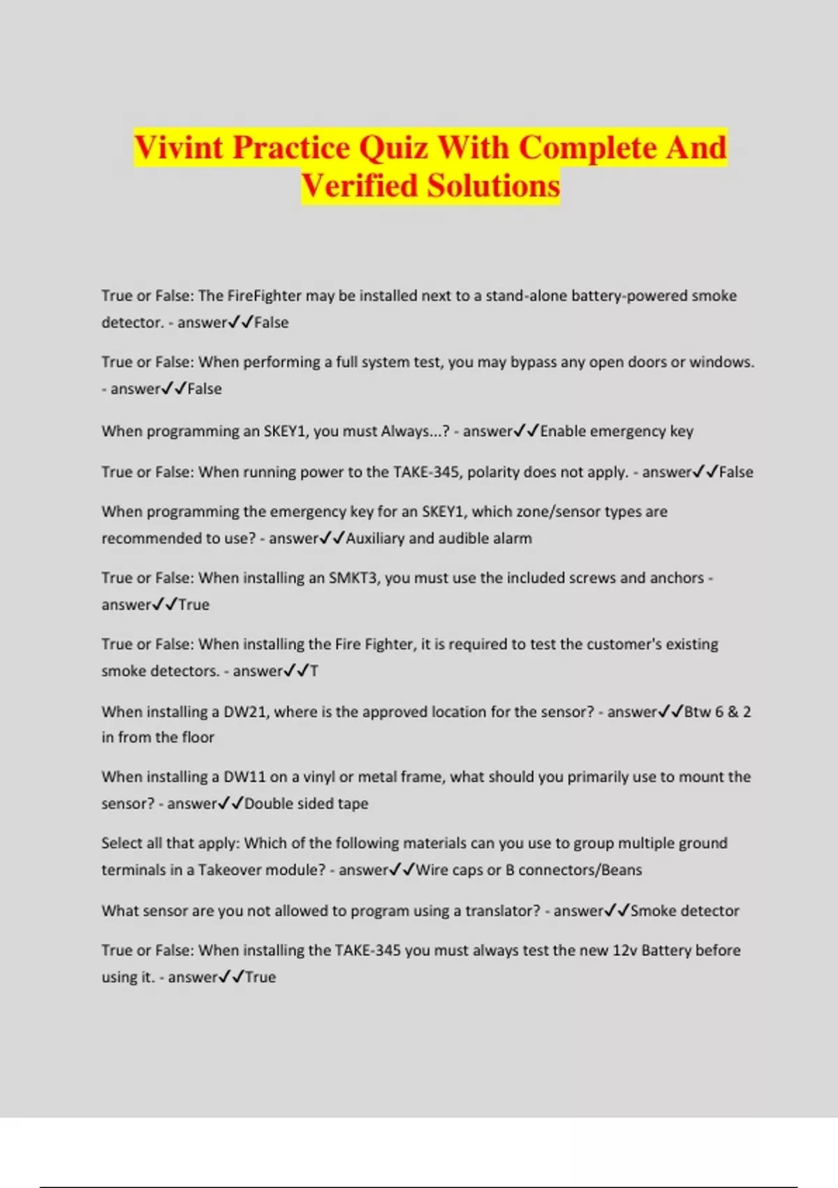 Vivint Practice Quiz With Complete And Verified Solutions True or False: The FireFighter may be installed next to a stand-alone battery-powered smoke detector. - answerFalse True or False: When performing a full system test, you may bypass any open doors or windows. - answerFalse When programming an SKEY1, you must Always...? - answerEnable emergency key True or False: When running power to the TAKE-345, polarity does not apply. - answerFalse When programming the emergency key for an SKEY1, which zone/sensor types are recommended to use? - answerAuxiliary and audible alarm True or False: When installing an SMKT3, you must use the included screws and anchors - answerTrue True or False: When installing the Fire Fighter, it is required to test the customer's existing smoke detectors. - answerT When installing a DW21, where is the approved location for the sensor? - answerBtw 6 & 2 in from the floor When installing a DW11 on a vinyl or metal frame, what should you primarily use to mount the sensor? - answerDouble sided tape Select all that apply: Which of the following materials can you use to group multiple ground terminals in a Takeover module? - answerWire caps or B connectors/Beans What sensor are you not allowed to program using a translator? - answerSmoke detector True or False: When installing the TAKE-345 you must always test the new 12v Battery before using it. - answerTrue What is the output voltage of the transformer used to power the Smart Hub? - answer12 VDC What is the minimum distance for placement of a CO3 from the corners on a wall? - answer12 in True or False: The SMKT3 has only 2 functions: smoke and heat detection. - answerFalse How would you program a CO3 if mounted on a hallway wall? - answerLoop 1, zone type 14 True or False: When installing a translator, you must program all of the existing sensors as new equipment on the panel. - answerfalse When programming a DW11 that has been installed on a window, which zone/sensor type should you use? - answer3 True or False: The DW21 sensor should always be installed in the door frame - answerTrue What equipment is used on all metal door frames - answerDW11 Which zone/sensor types are used when programming an SMKT3? - answerType 9 smoke detection, type 8 freeze detection, type 9 heat de