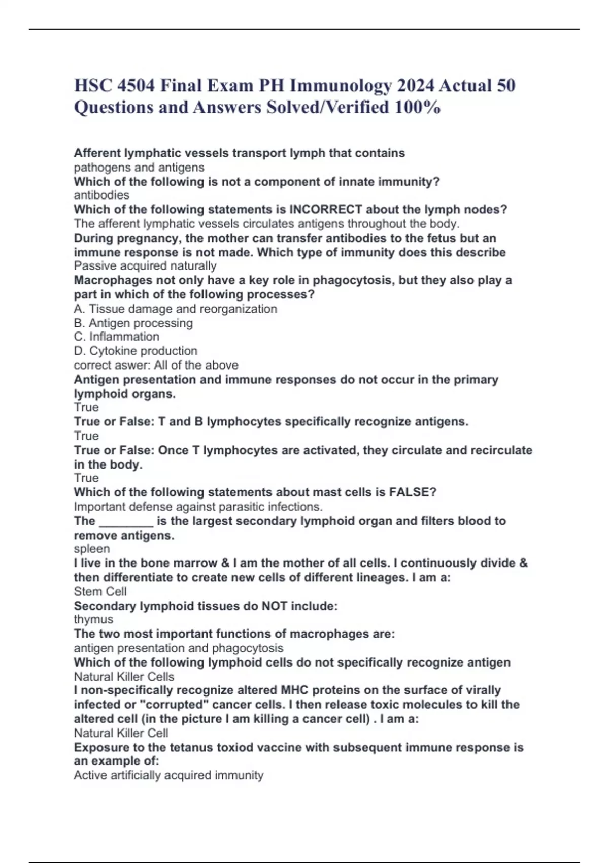 HSC 4504 Final Exam PH Immunology 2024 Actual 50 Questions and Answers Solved/Verified 100% Afferent lymphatic vessels transport lymph that contains pathogens and antigens Which of the following is not a component of innate immunity? antibodies Which of the following statements is INCORRECT about the lymph nodes? The afferent lymphatic vessels circulates antigens throughout the body. During pregnancy, the mother can transfer antibodies to the fetus but an immune response is not made. Which type of immunity does this describe Passive acquired naturally Macrophages not only have a key role in phagocytosis, but they also play a part in which of the following processes? A. Tissue damage and reorganization B. Antigen processing C. Inflammation D. Cytokine production correct aswer: All of the above Antigen presentation and immune responses do not occur in the primary lymphoid organs. True True or False: T and B lymphocytes specifically recognize antigens. True True or False: Once T lymphocytes are activated, they circulate and recirculate in the body. True Which of the following statements about mast cells is FALSE? Important defense against parasitic infections. The ________ is the largest secondary lymphoid organ and filters blood to remove antigens. spleen I live in the bone marrow & I am the mother of all cells. I continuously divide & then differentiate to create new cells of different lineages. I am a: Stem Cell Secondary lymphoid tissues do NOT include: thymus The two most important functions of macrophages are: antigen presentation and phagocytosis Which of the following lymphoid cells do not specifically recognize antigen Natural Killer Cells I non-specifically recognize altered MHC proteins on the surface of virally infected or "corrupted" cancer cells. I then release toxic molecules to kill the altered cell (in the picture I am killing a cancer cell) . I am a: Natural Killer Cell Exposure to the tetanus toxiod vaccine with subsequent immune response is an example of: Active artificially acquired immunity