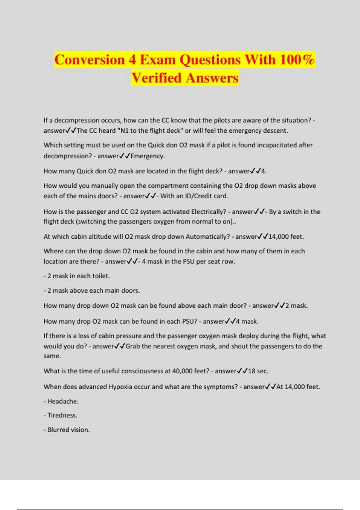 Conversion 4 Exam Questions With 100% Verified Answers If a decompression occurs, how can the CC know that the pilots are aware of the situation? - answerThe CC heard "N1 to the flight deck" or will feel the emergency descent. Which setting must be used on the Quick don O2 mask if a pilot is found incapacitated after decompression? - answerEmergency. How many Quick don O2 mask are located in the flight deck? - answer4. How would you manually open the compartment containing the O2 drop down masks above each of the mains doors? - answer- With an ID/Credit card. How is the passenger and CC O2 system activated Electrically? - answer- By a switch in the flight deck (switching the passengers oxygen from normal to on).. At which cabin altitude will O2 mask drop down Automatically? - answer14,000 feet. Where can the drop down O2 mask be found in the cabin and how many of them in each location are there? - answer- 4 mask in the PSU per seat row. - 2 mask in each toilet. - 2 mask above each main doors. How many drop down O2 mask can be found above each main door? - answer2 mask. How many drop O2 mask can be found in each PSU? - answer4 mask. If there is a loss of cabin pressure and the passenger oxygen mask deploy during the flight, what would you do? - answerGrab the nearest oxygen mask, and shout the passengers to do the same. What is the time of useful consciousness at 40,000 feet? - answer18 sec. When does advanced Hypoxia occur and what are the symptoms? - answerAt 14,000 feet. - Headache. - Tiredness. - Blurred vision. - Loss of muscular coordination and - Posible personality change. Which factors will have a direct influence on the effects of Hypoxia? - answer- The altitude reach. - Rate of ascent. - Duration of exposure. - Individual tolerance. - Physical fitness. - Physical activity. - Psychological factors. - Environmental temperature. - Alcohol and smoking. - Medical conditions. What altitude does Extreme Hypoxia occur at? - answer20,000 feet. What altitude does Mild Hypoxia occur at? - answer10,000 feet. Headache, tiredness, burred vision, loss of muscular co-ordination, and possible personality changes are symptoms of? - answerAdvanced Hypoxia. What are the symptoms of Mild Hypoxia? - answer- Headache. - Yawing. - Occasional deep breath. What are the material defects of a rapid decompression? - answer- Aloud explosive noise. - Air rising towards the failure (the hole) carrying loose article, papers, dust etc. - A dense fog will form in the cabin momentarily as the moisture held in the cabin condense. - Hot liquids will suddenly boil over (risk of scalding) doe to the reduced boiling point. - Oxygen mask will drop dow. - Fasten seatbelts sign will illuminates. What is a rapid decompression? - answerThis is a sudden loos of cabin pressure , which takes less than 10 sec. to equalize with the outside pressure. What is a Slow decompression? - answerThis is a gradual loss of cabin pressure, which can take more than 10 sec. to equalize with the outside pressure. At cruising altitude 0f 37,000 ft a/c need to be pressurized for us to be able to breath, to what altitude is a/c pressurised? - answer6,000-8,000 ft. At which altitude does extreme Hypoxia occur and what are the Symptoms? - answer20,000 ft. - Convulsion. - Colapse. - Coma. - Possible death within minutes. Decompression. What should the N2 do upon hearing "N1 to the flight deck"? - answer- Stow the trolleys and go to the FD galley. - Make a no smoking and reassurance PA. For how long will the generator produce the oxygen for passengers and crew? - answer12 min. What are the physical effects of a rapid decompression? - answer- Severe ear and sinus pain. - Chest and joint pain caused by nitrogen bubb